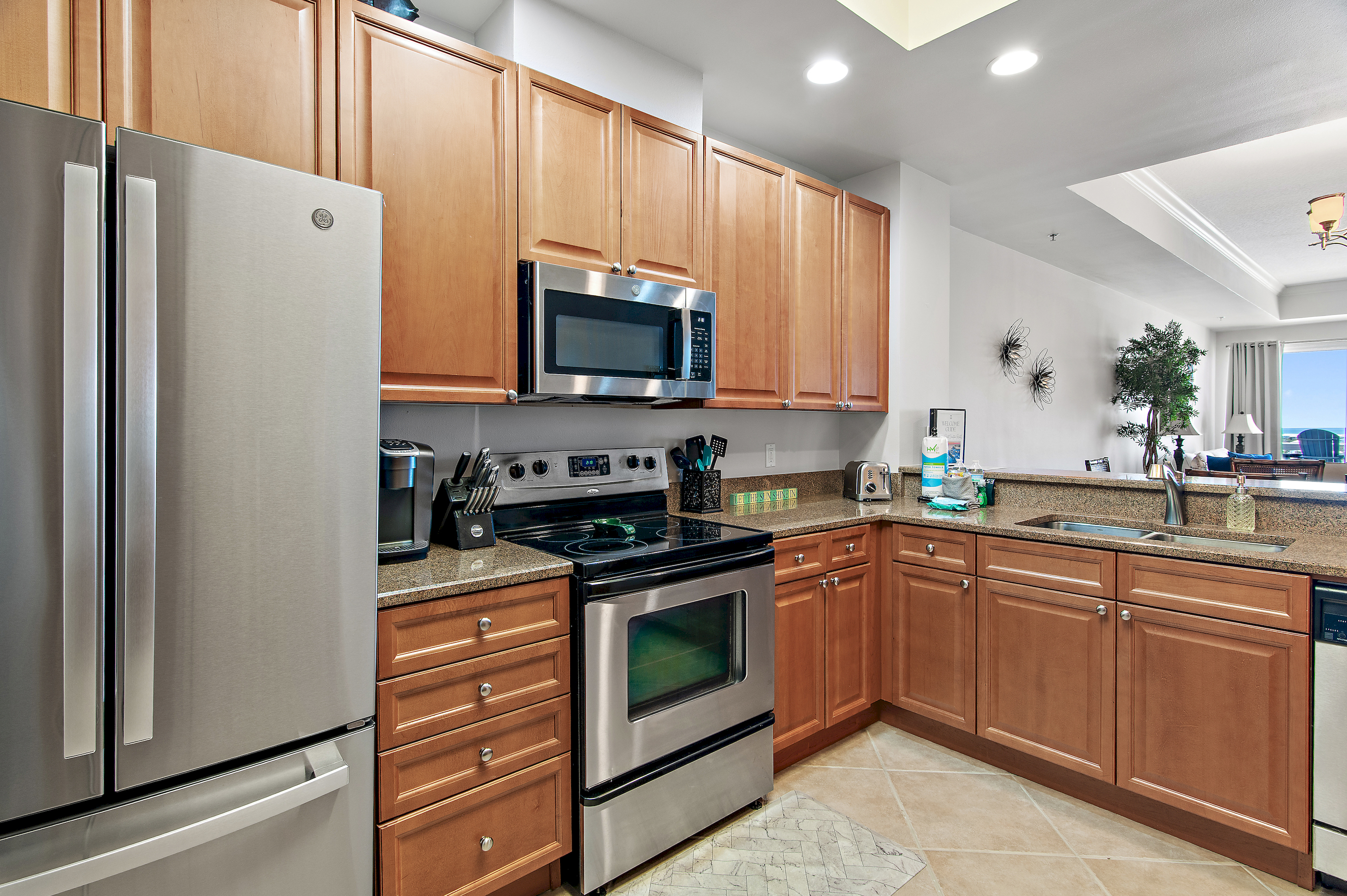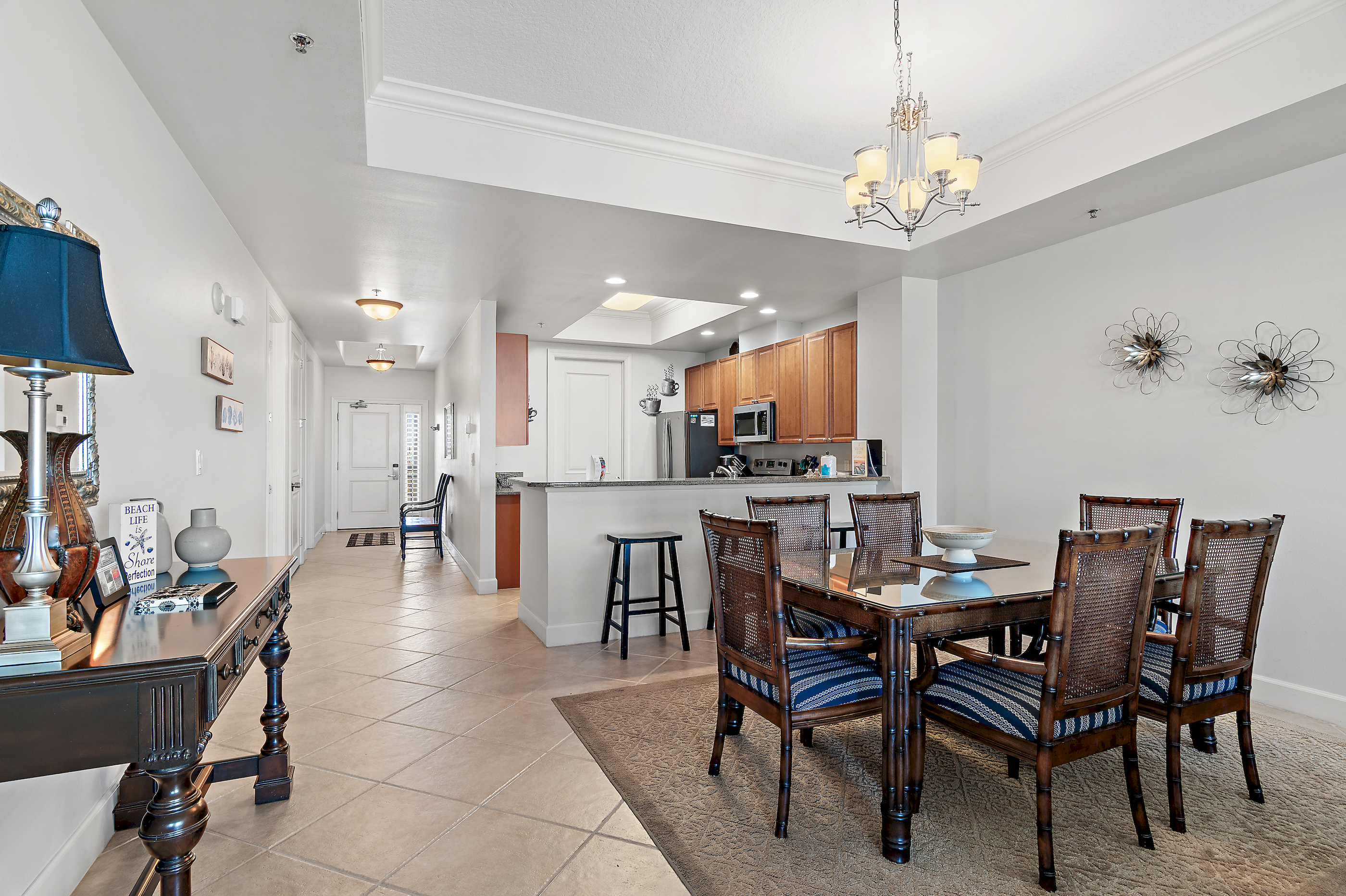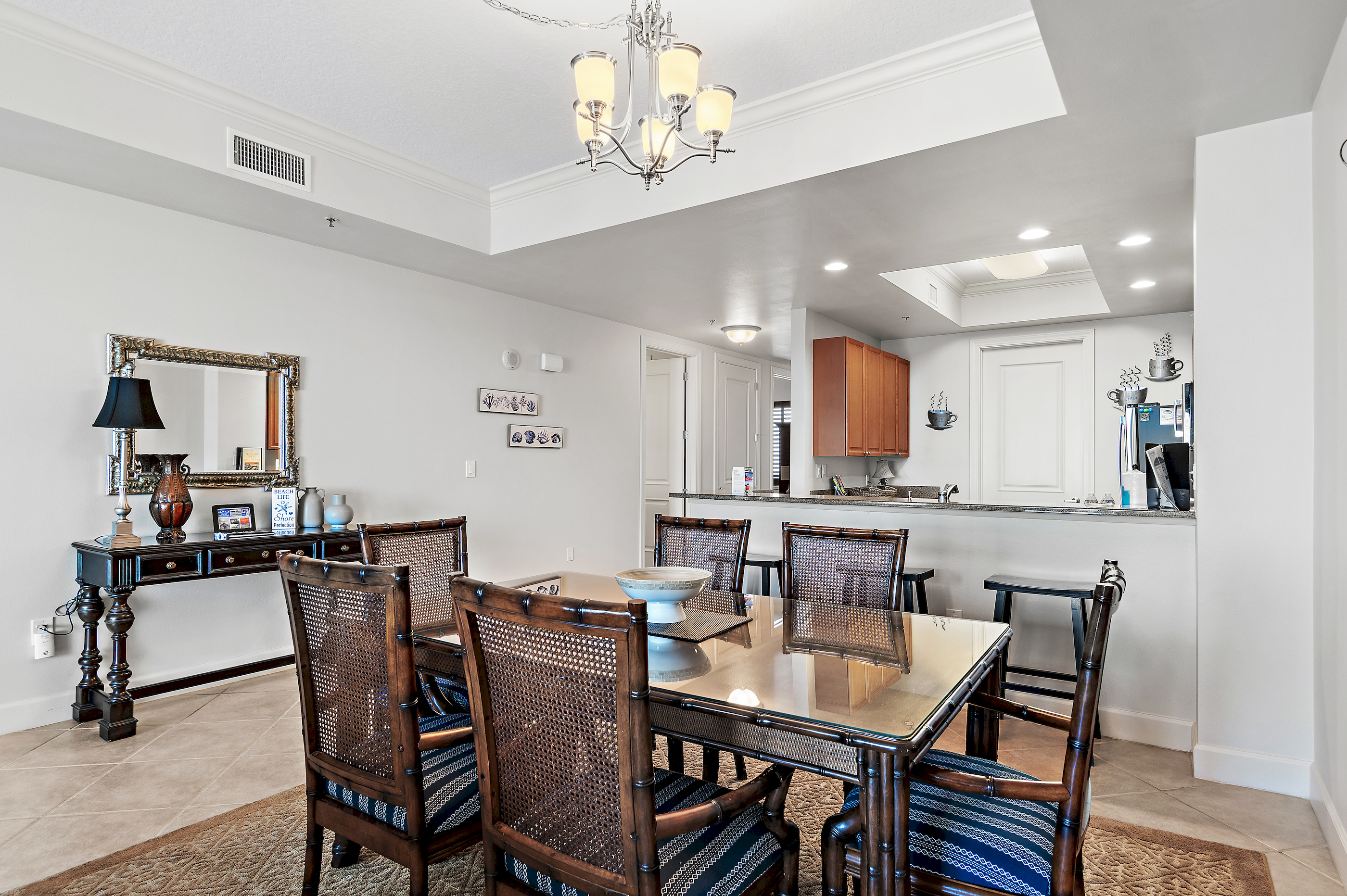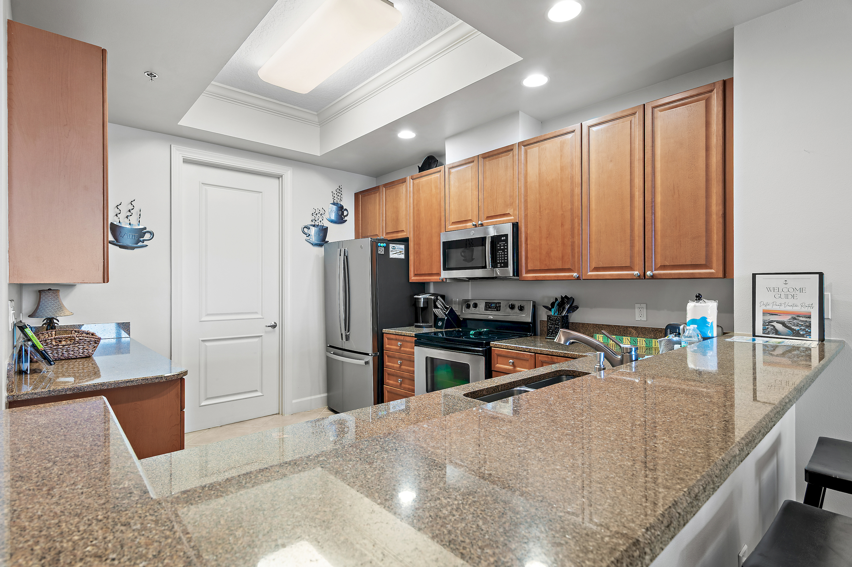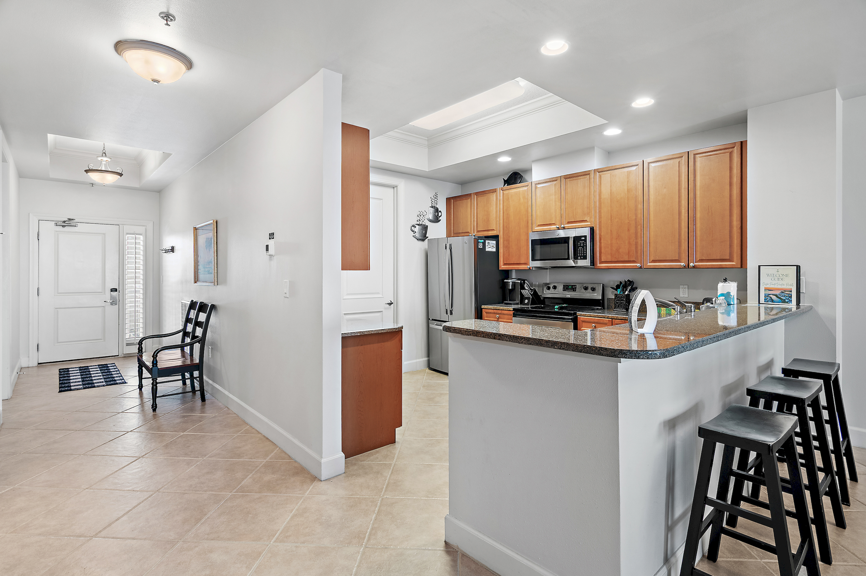 The fully equipped kitchen features a breakfast bar with seating, ideal for casual meals, morning coffee, or entertaining after a beach day.