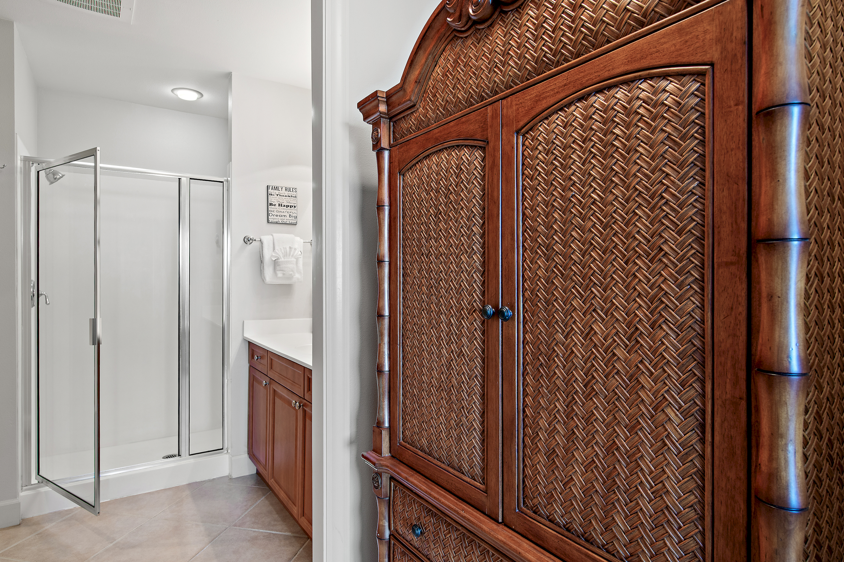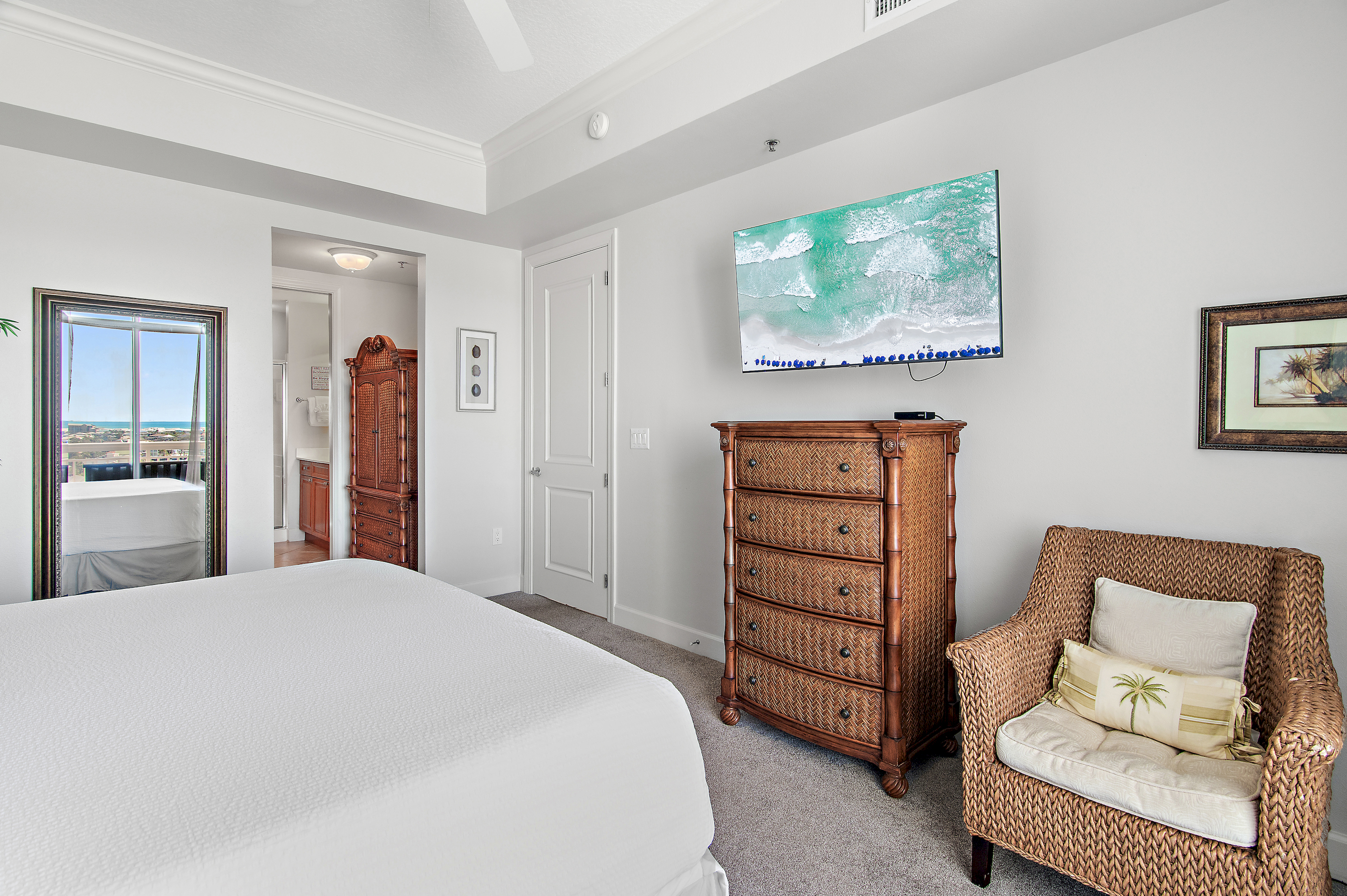 Master Suite: Wake up to breathtaking ocean views through floor-to-ceiling windows from your king-size bed. The private ensuite bathroom includes a jetted soaking tub and a separate walk-in shower—your personal spa retreat.