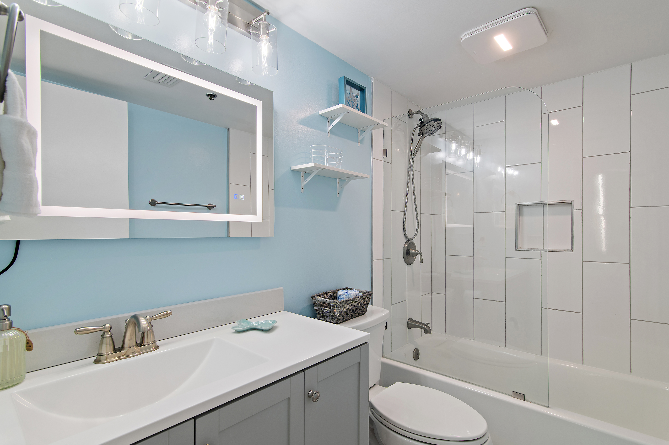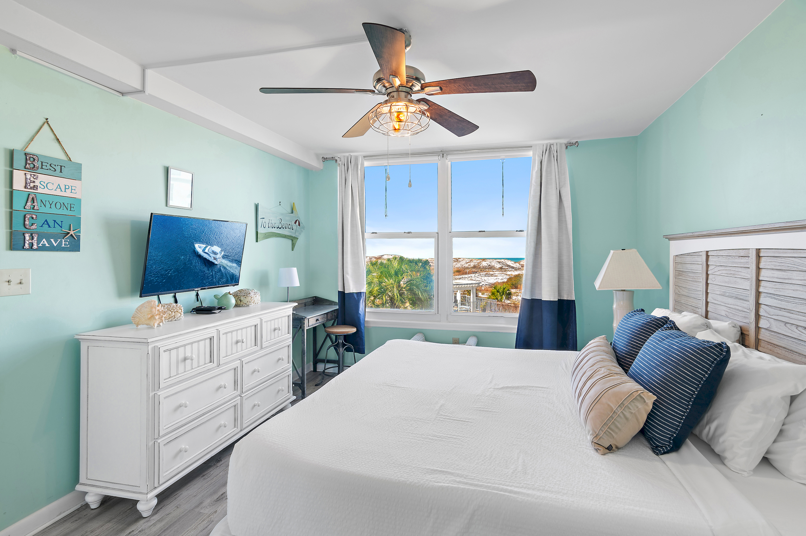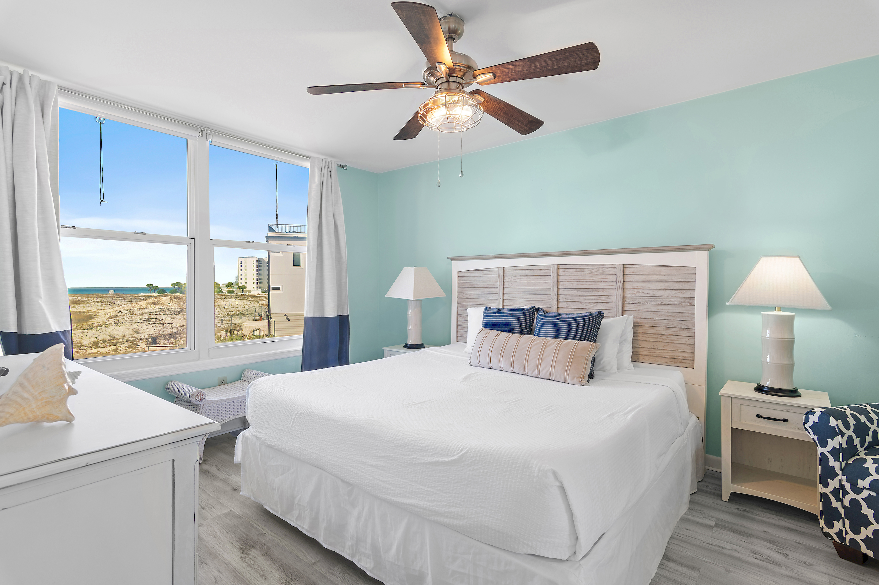 The master bedroom features a bath and shower combo, providing a relaxing space to clean up after a day at the beach.