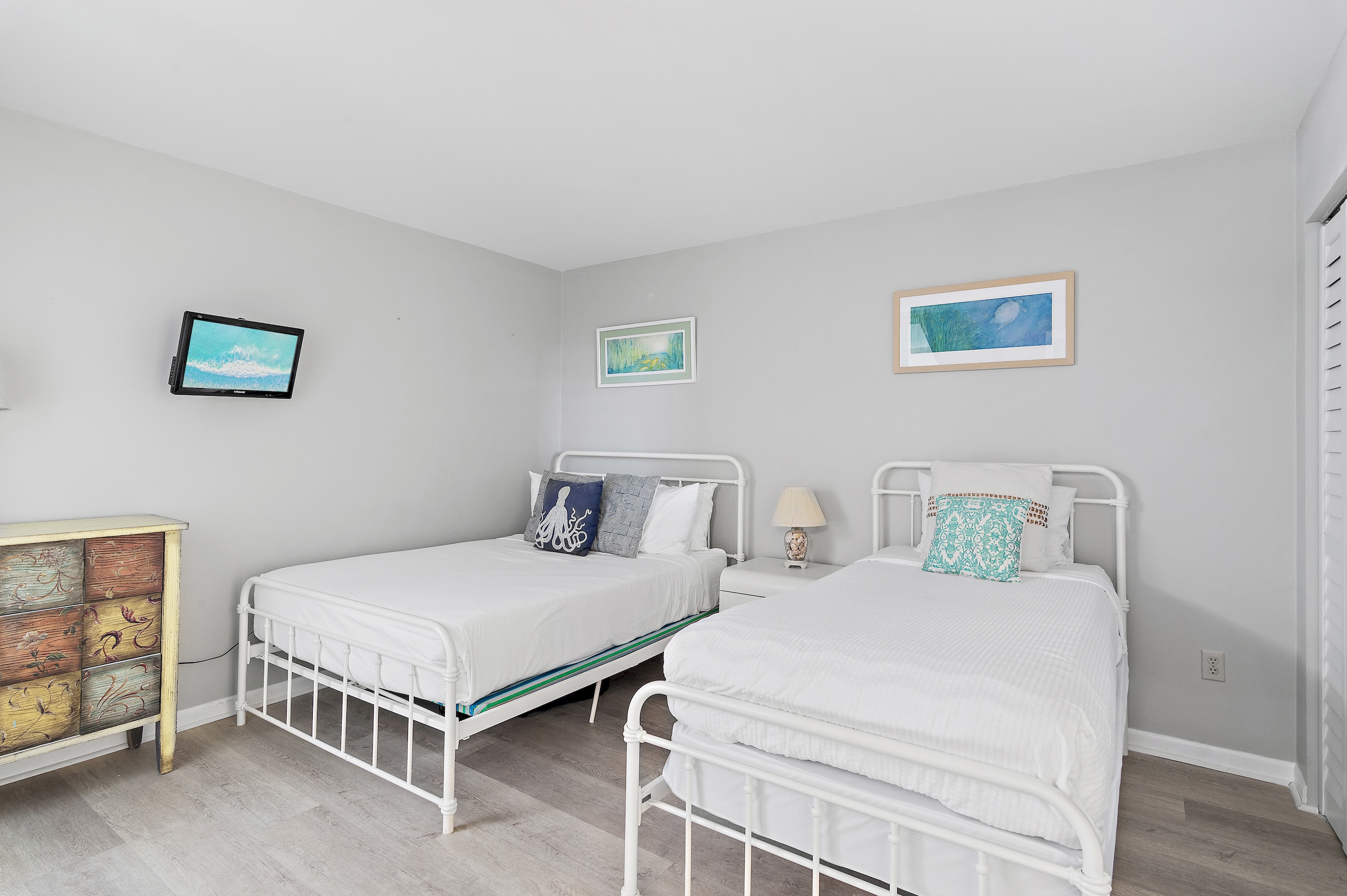 Magnolia House 302 is a two-bedroom, two-bathroom condo featuring a light, airy atmosphere with crisp white walls and a relaxed coastal feel. The bedrooms are furnished with comfortable beds, including a king bed in the master bedroom, a full and twin bed in the second bedroom, and a queen sleeper sofa in the living area for additional sleeping accommodations.