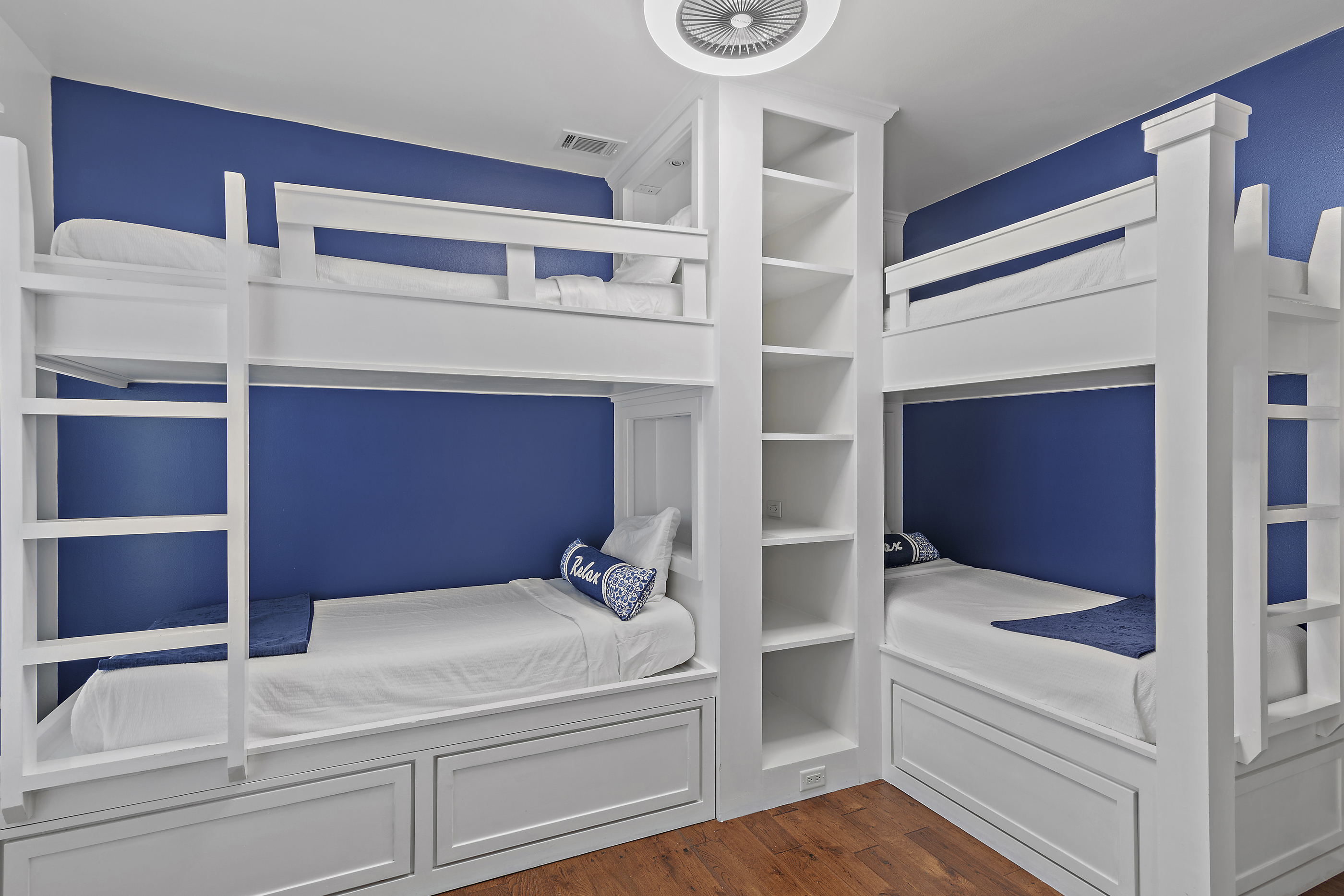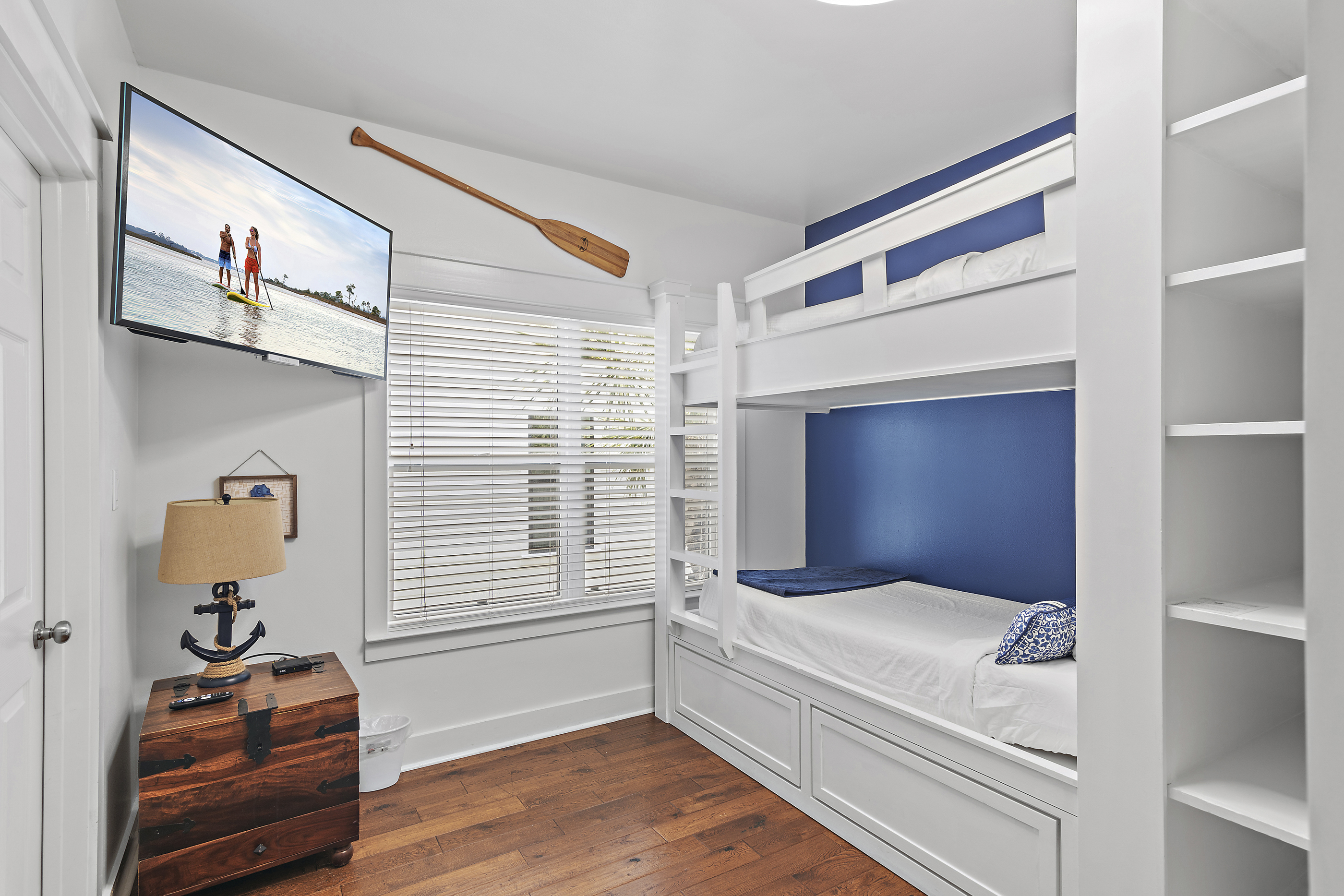 This perfect beach getaway can occupy up to ten guests. The master bedroom offers a king-sized bed, a flat-screen TV, and a private bathroom with a walk-in shower. The second bedroom offers a queen-sized bed and flat-screen TV. The bunk room offers two twin over twin bunk beds with a twin trundle bed.