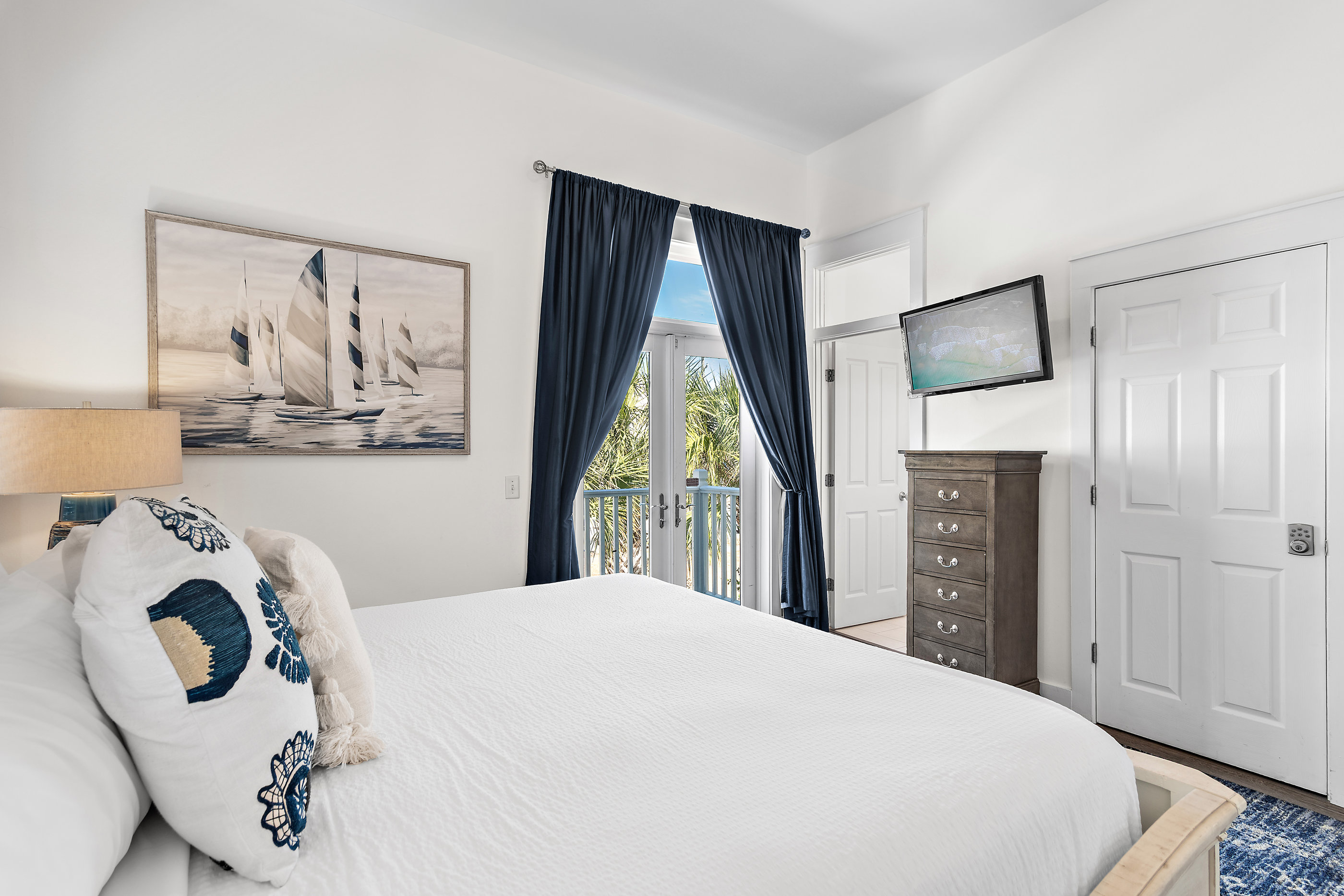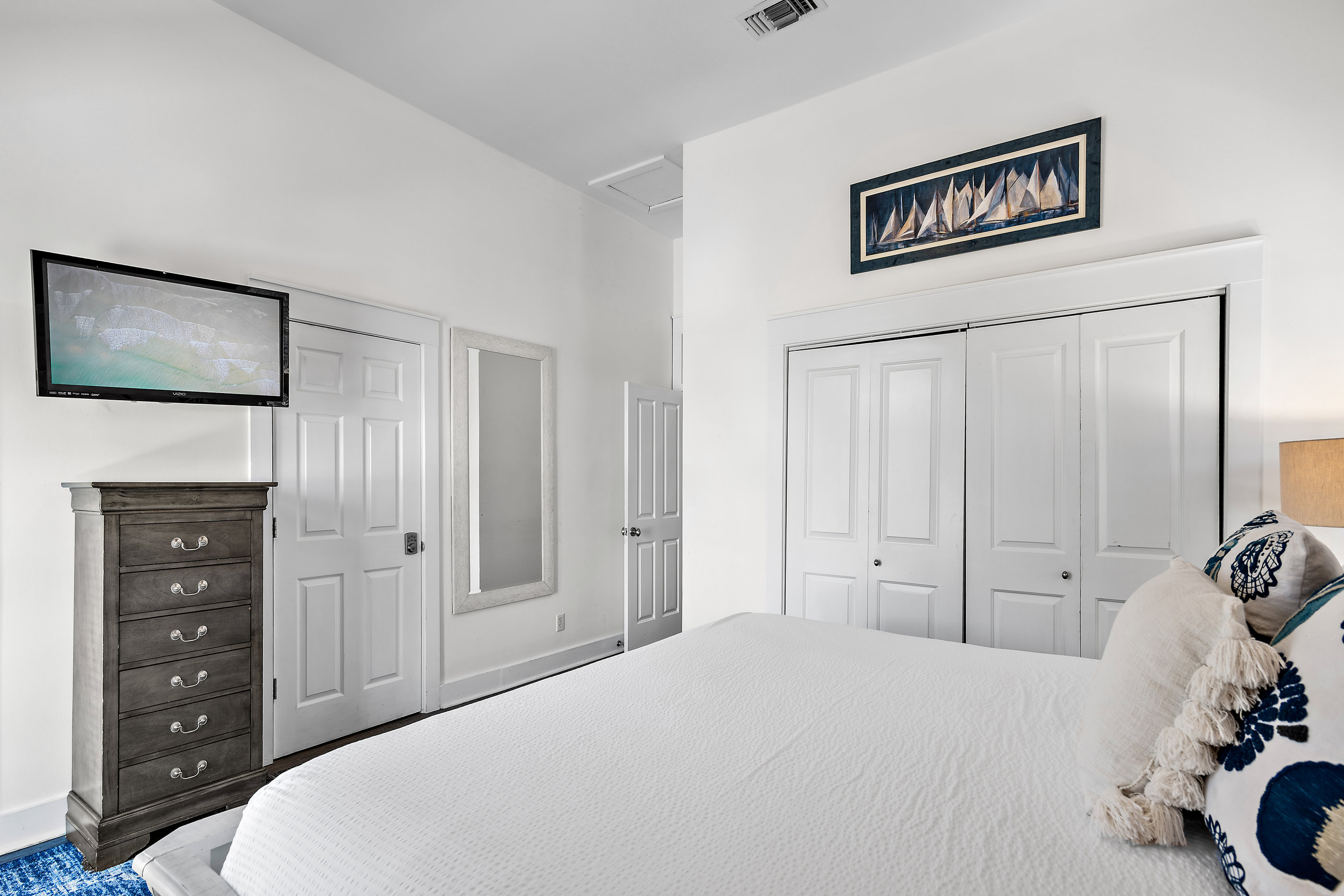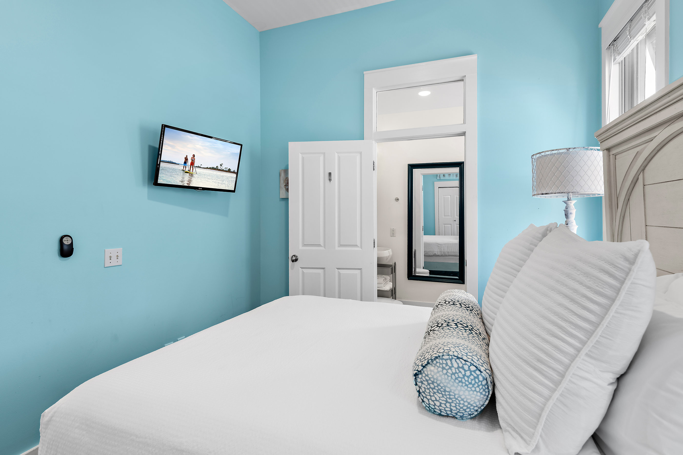 This level also hosts the remaining bedrooms. Two beautifully appointed queen suites feature spacious closets, flat-screen TVs, and private en-suite bathrooms with shower/tub combinations. The king suite is the crown jewel of the home, offering a private balcony with pool access and a spa-like en-suite bathroom with a double walk-in shower and dual vanities.