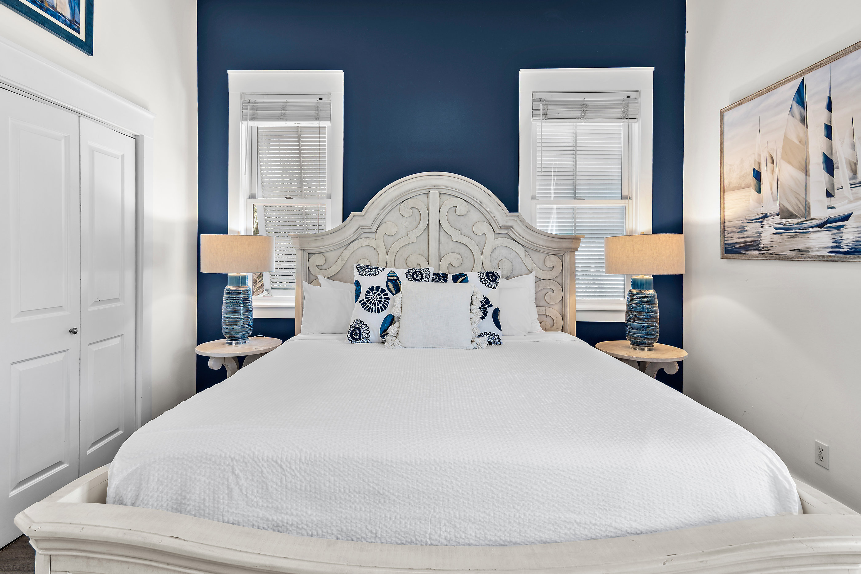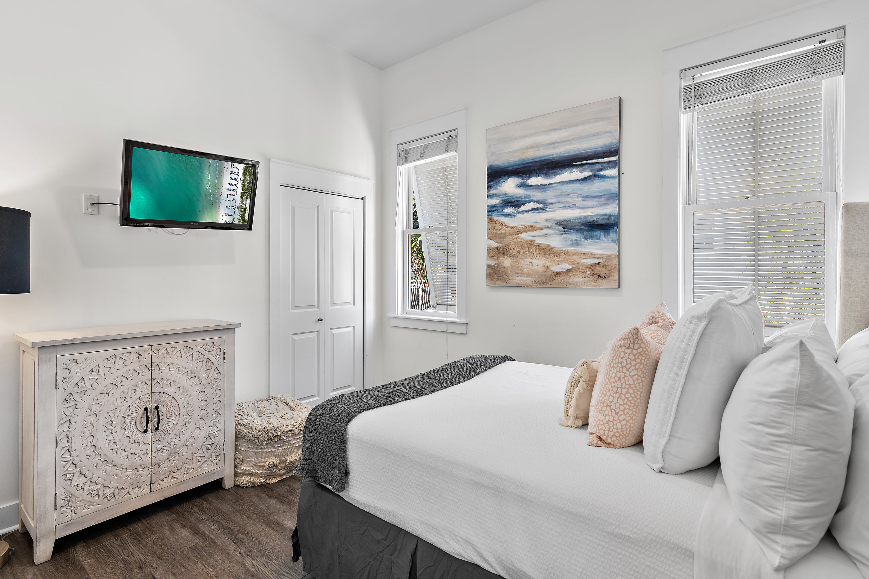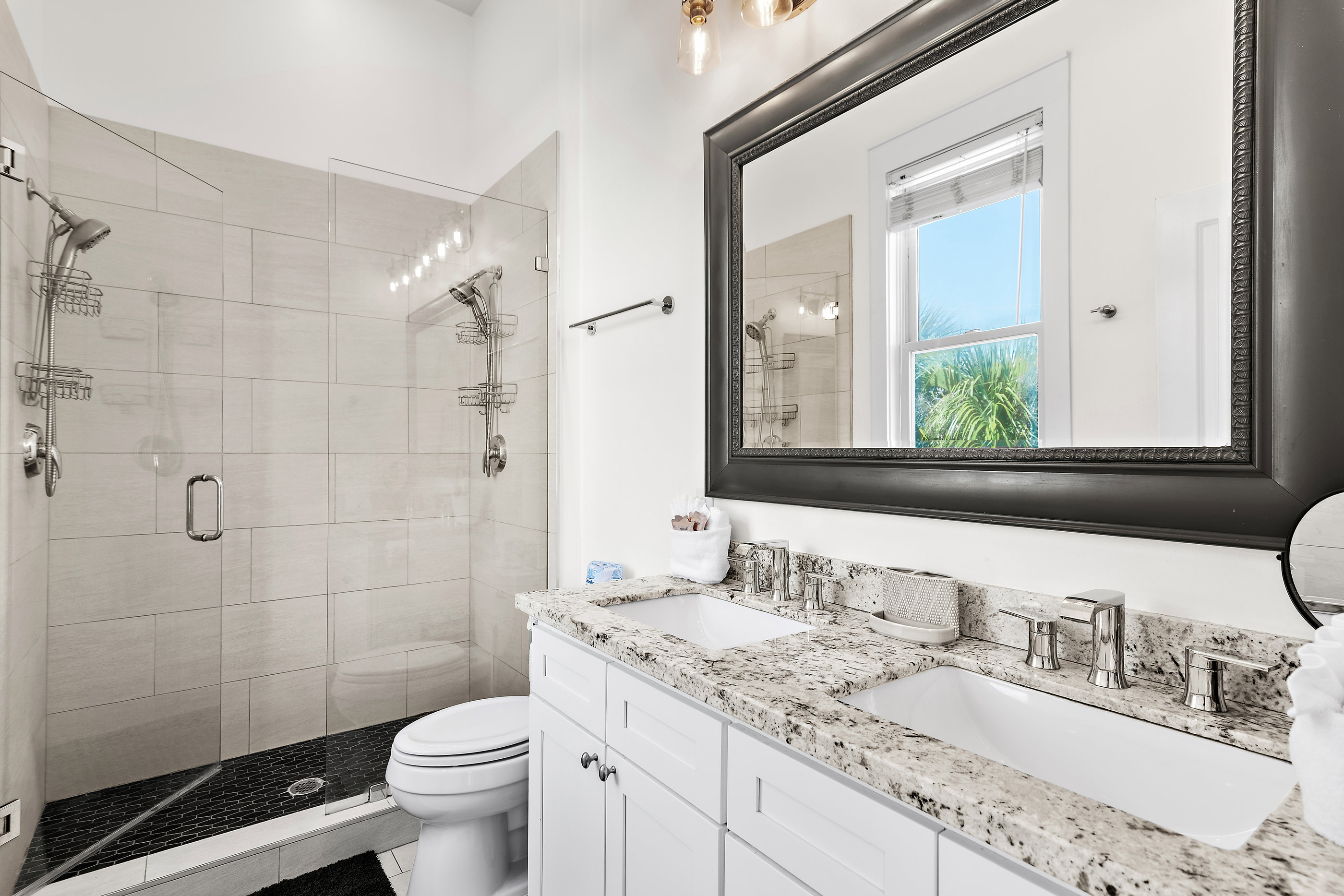 This level also hosts the remaining bedrooms. Two beautifully appointed queen suites feature spacious closets, flat-screen TVs, and private en-suite bathrooms with shower/tub combinations. The king suite is the crown jewel of the home, offering a private balcony with pool access and a spa-like en-suite bathroom with a double walk-in shower and dual vanities.