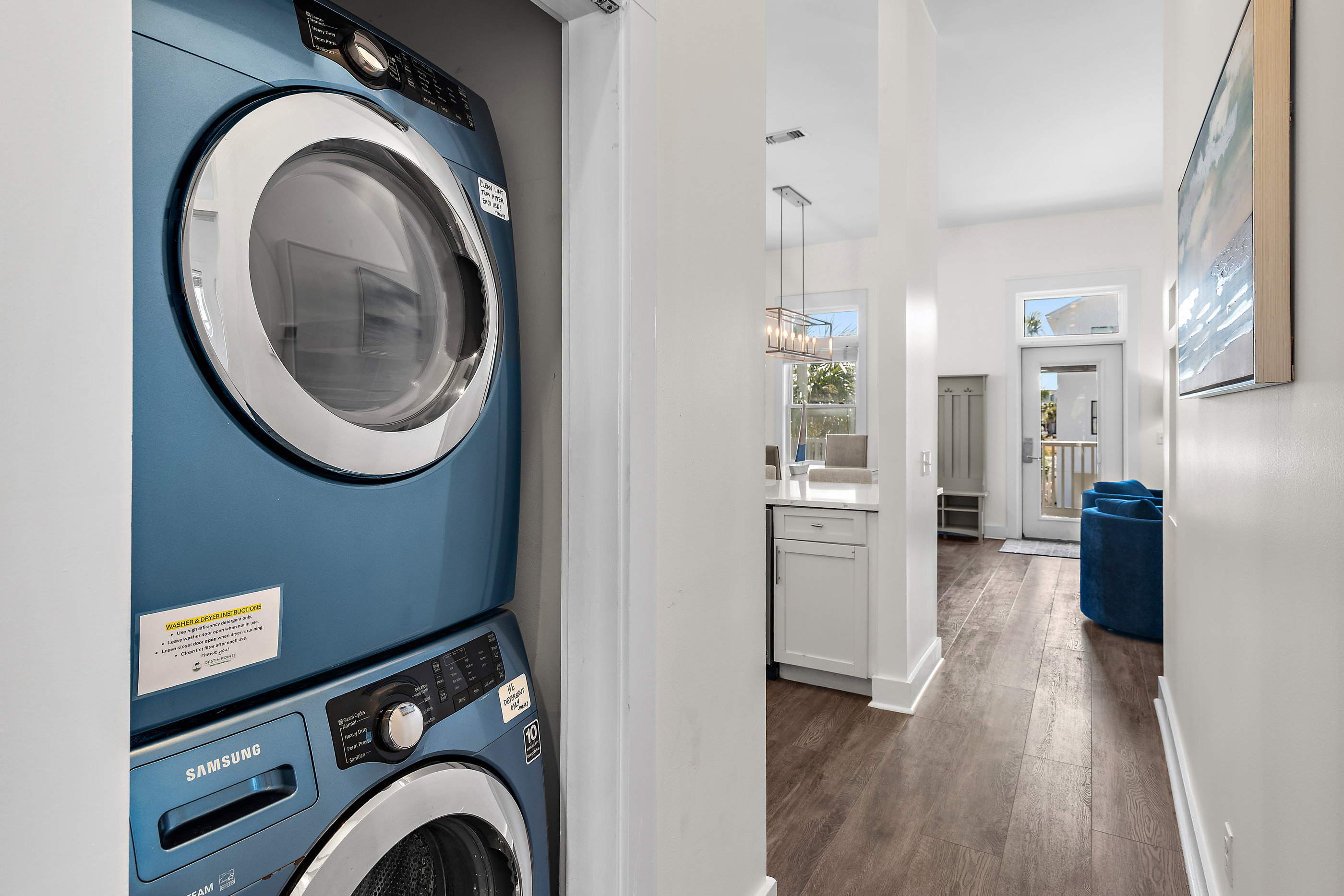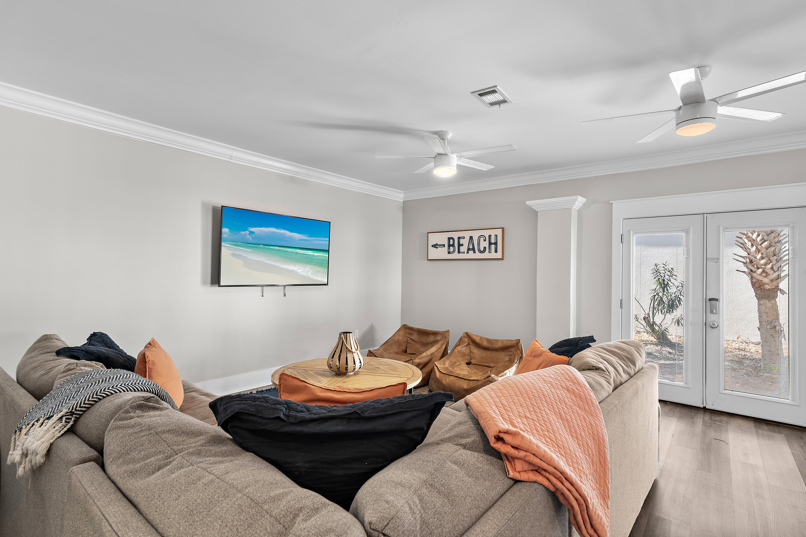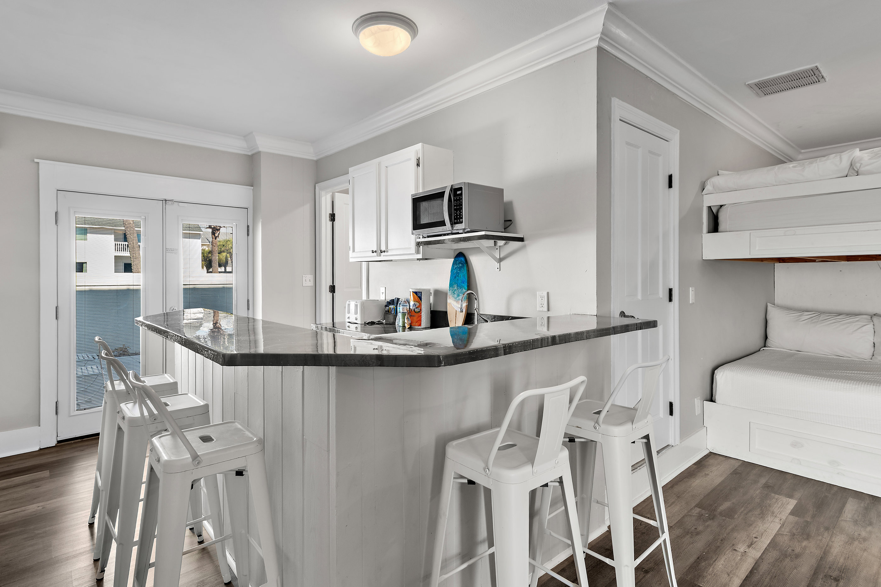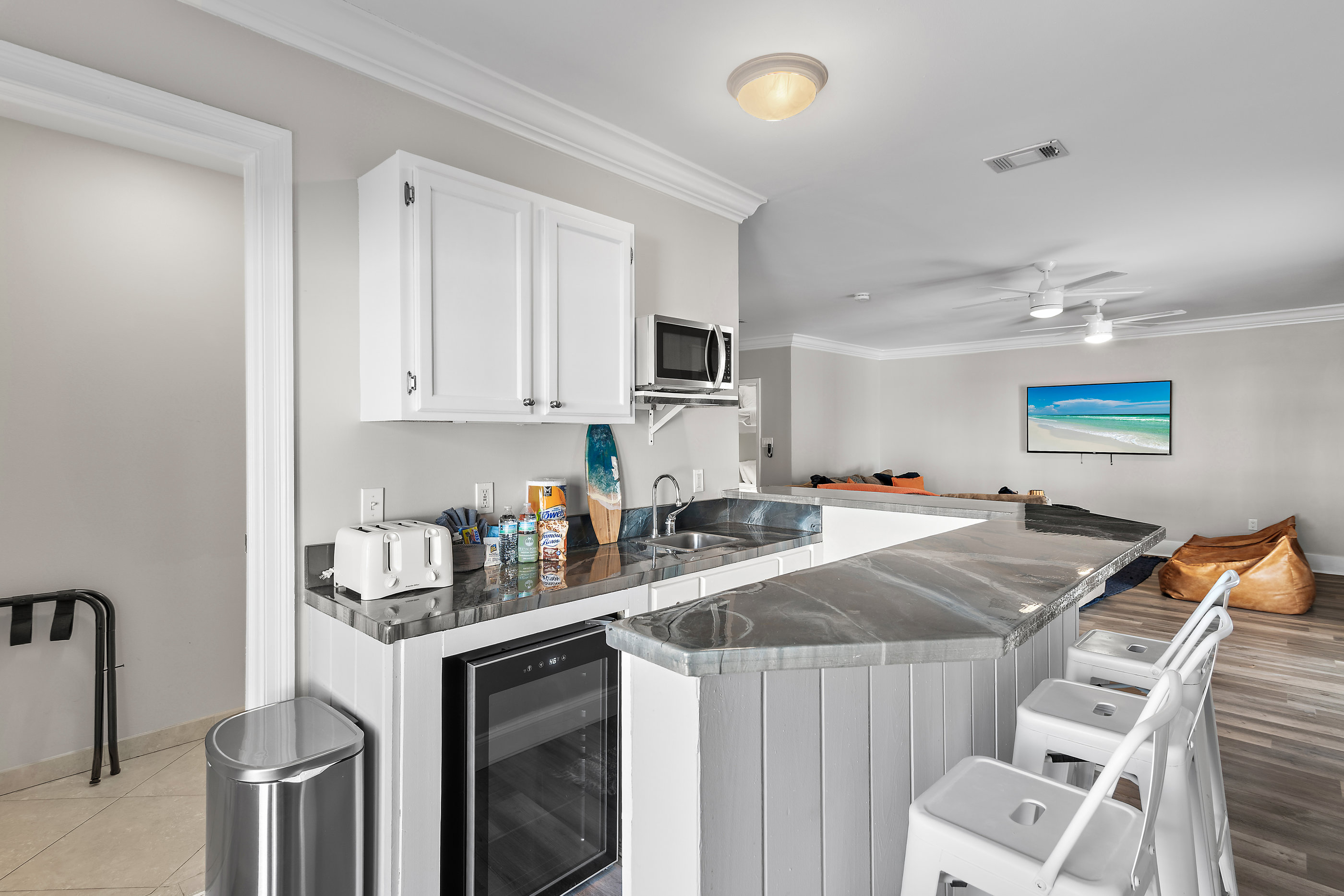 The ground floor functions as a fully equipped private living unit, making it ideal for families with young children or guests who prefer to avoid stairs. This level features an open-concept living area with a plush sectional and flat-screen TV, perfect for winding down after a day in the sun. The well-appointed kitchenette includes modern appliances and a wine refrigerator for added convenience.