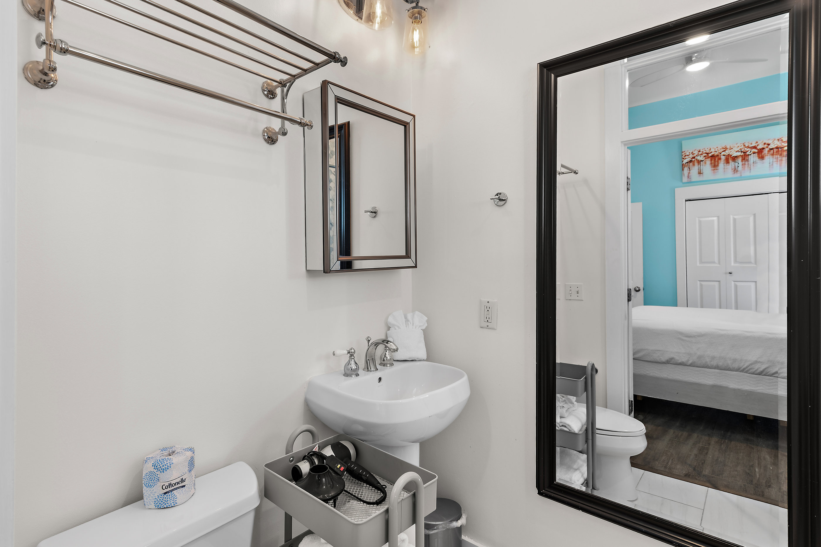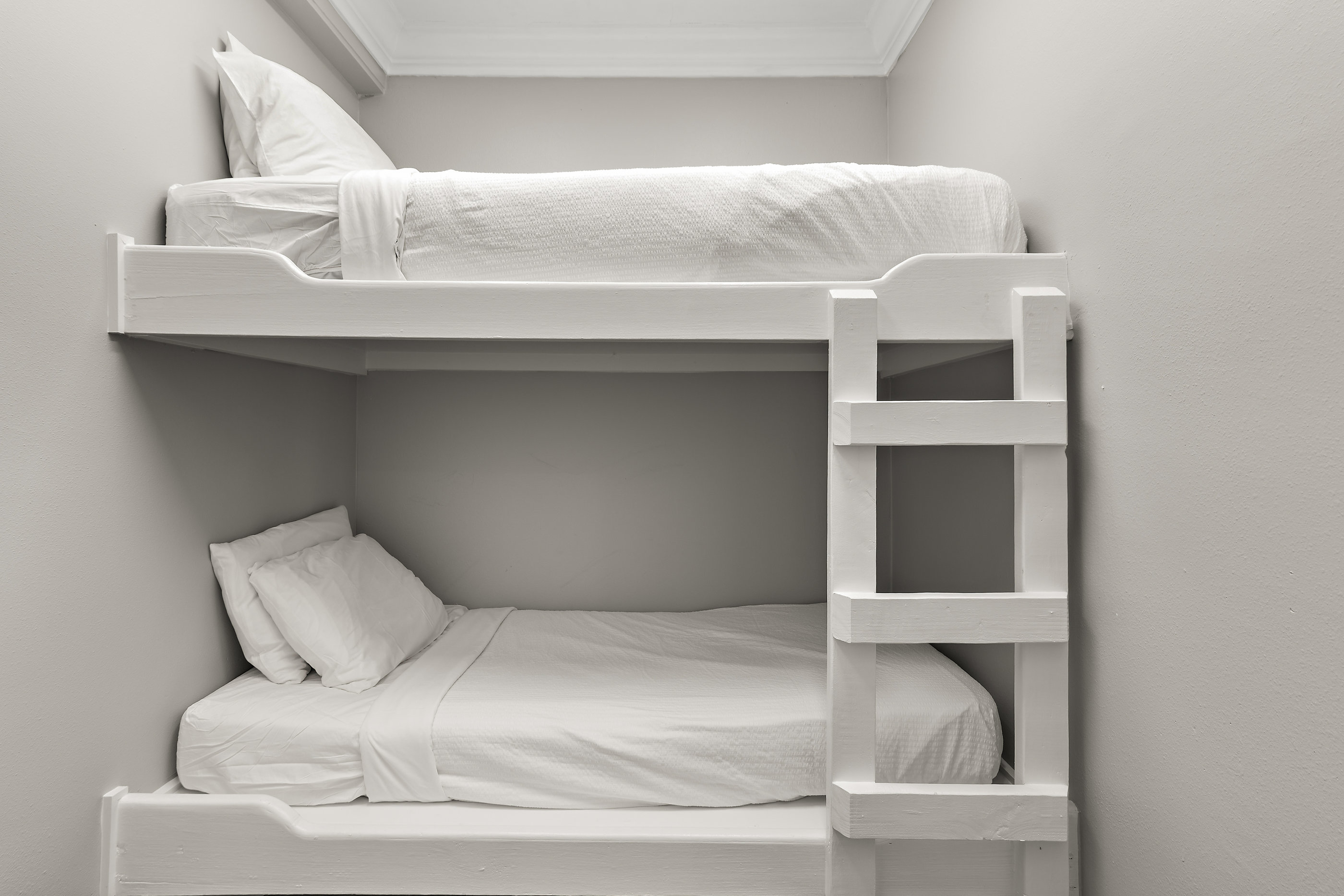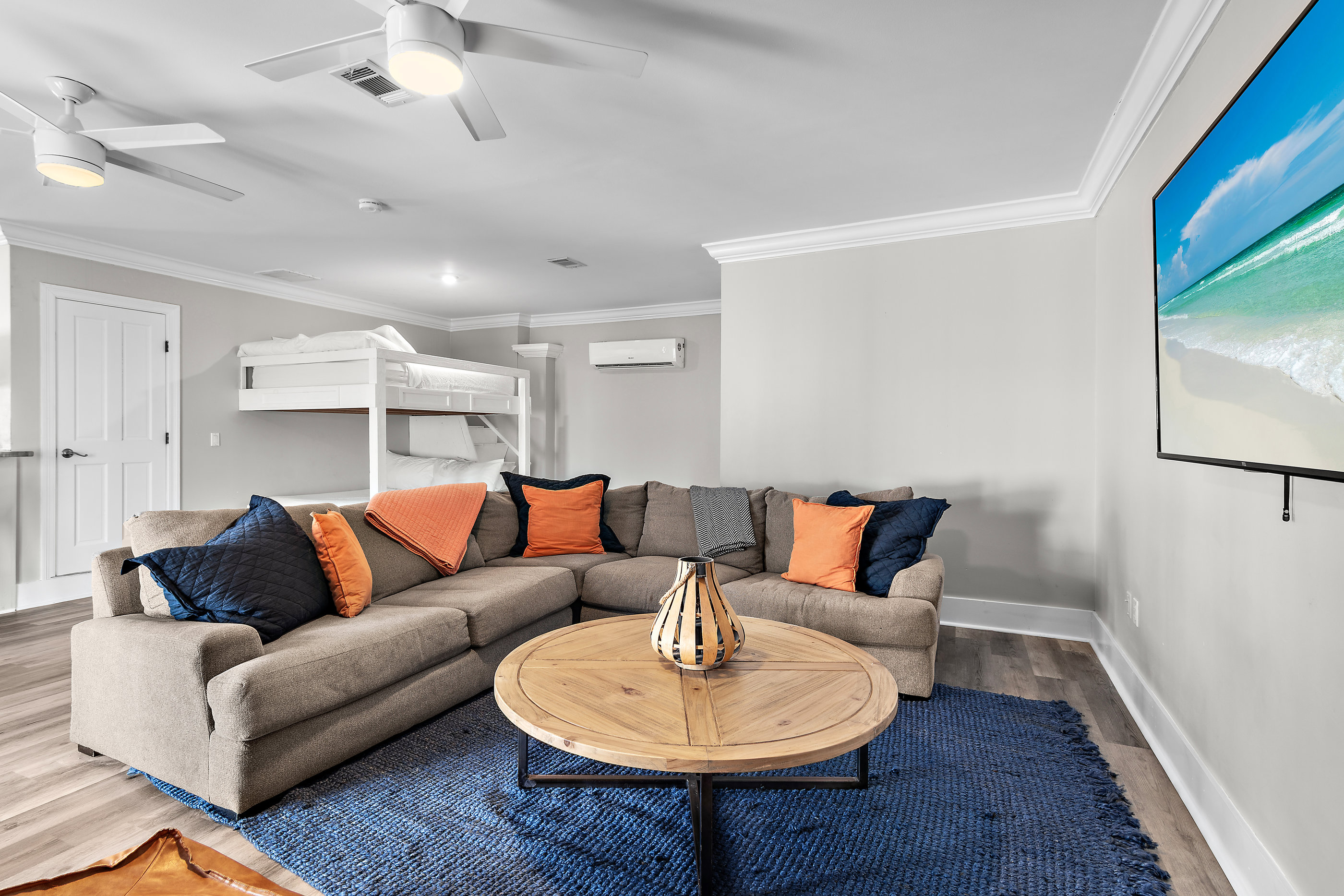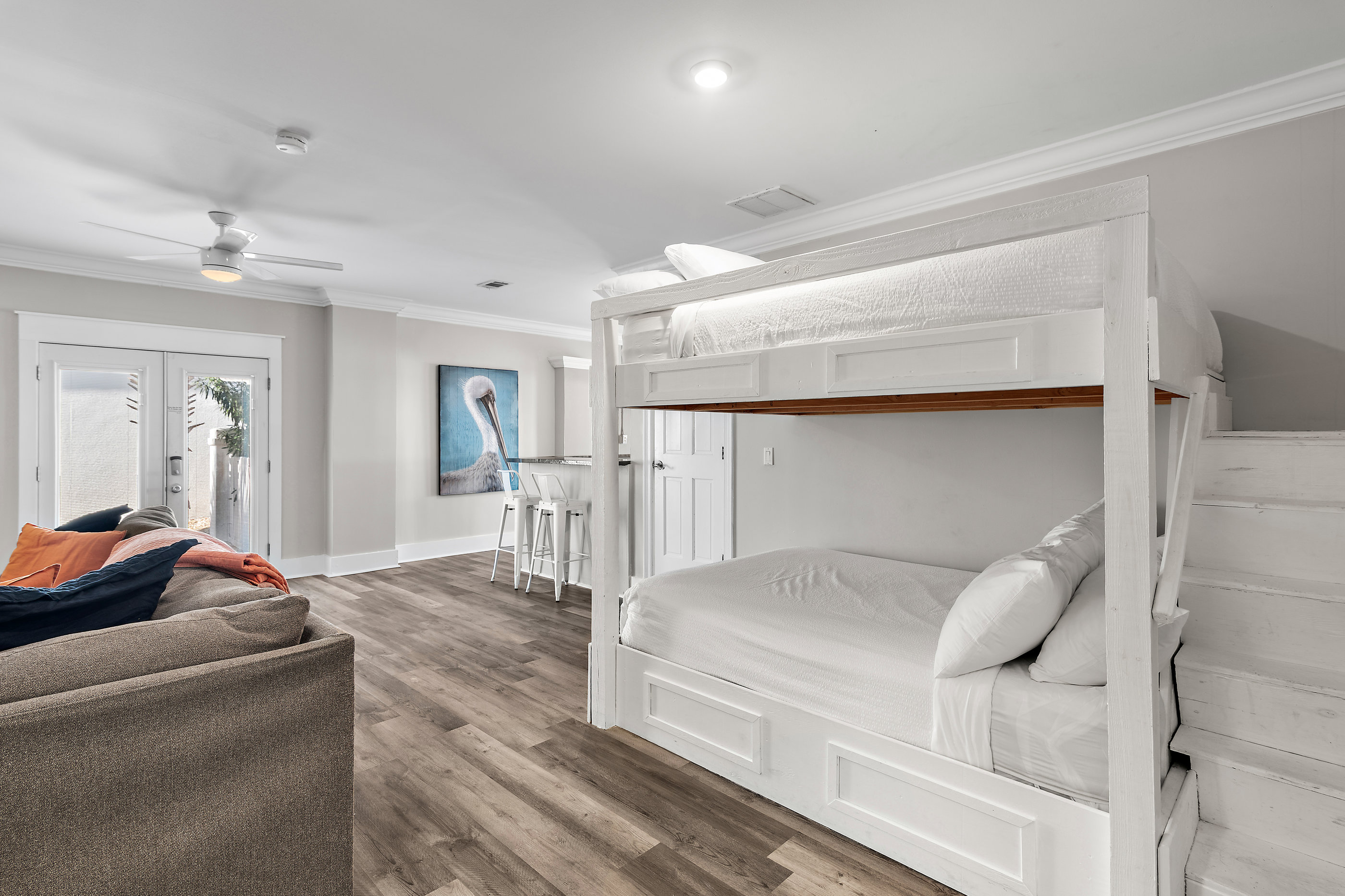 Sleeping accommodations on this level are designed for flexibility, with a queen-over-queen bunk in the living area and a twin-over-twin bunk room tucked away for extra privacy. A shared bathroom with a walk-in shower completes the space. Best of all, guests enjoy direct access to the private pool, making pool days seamless and stress-free.