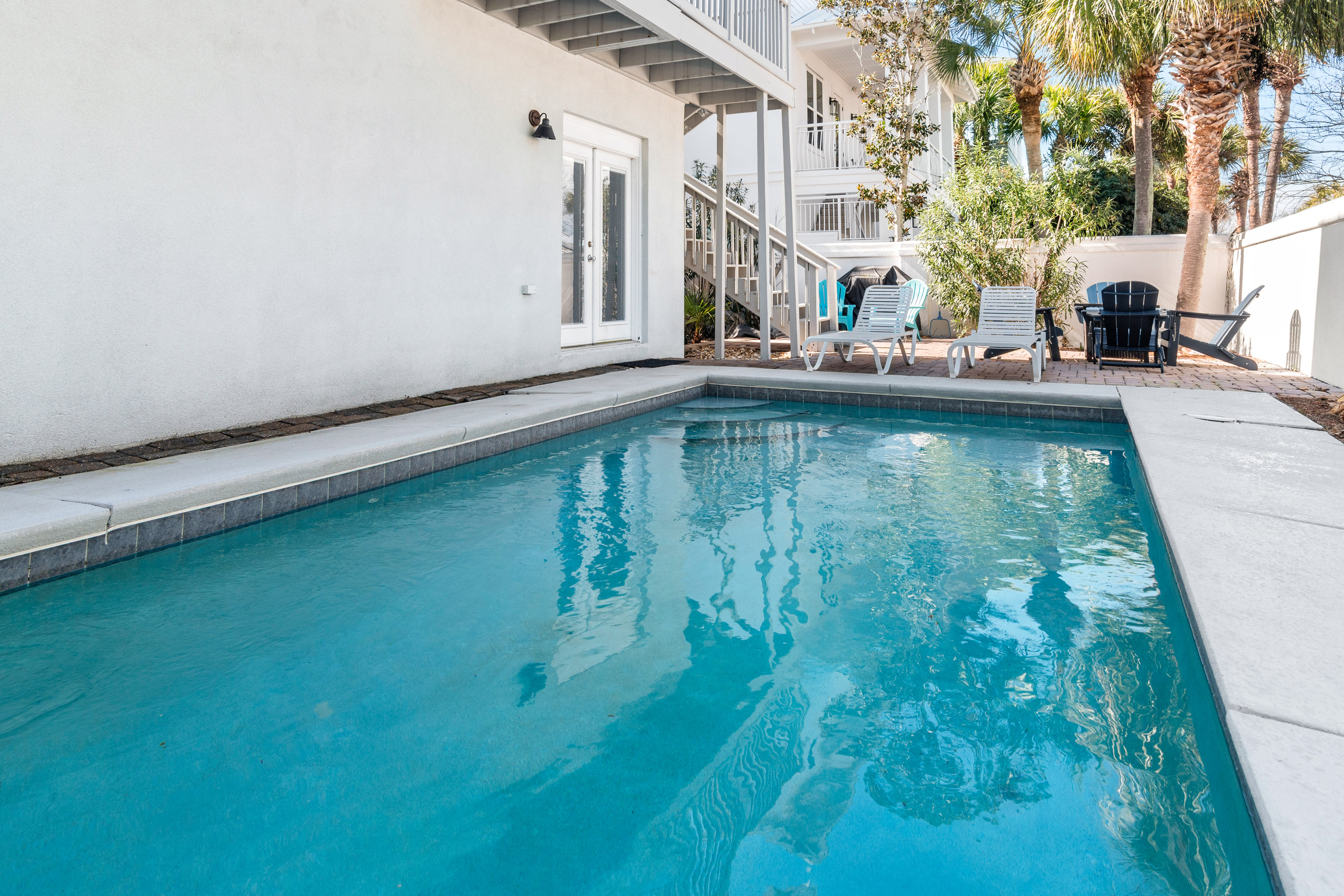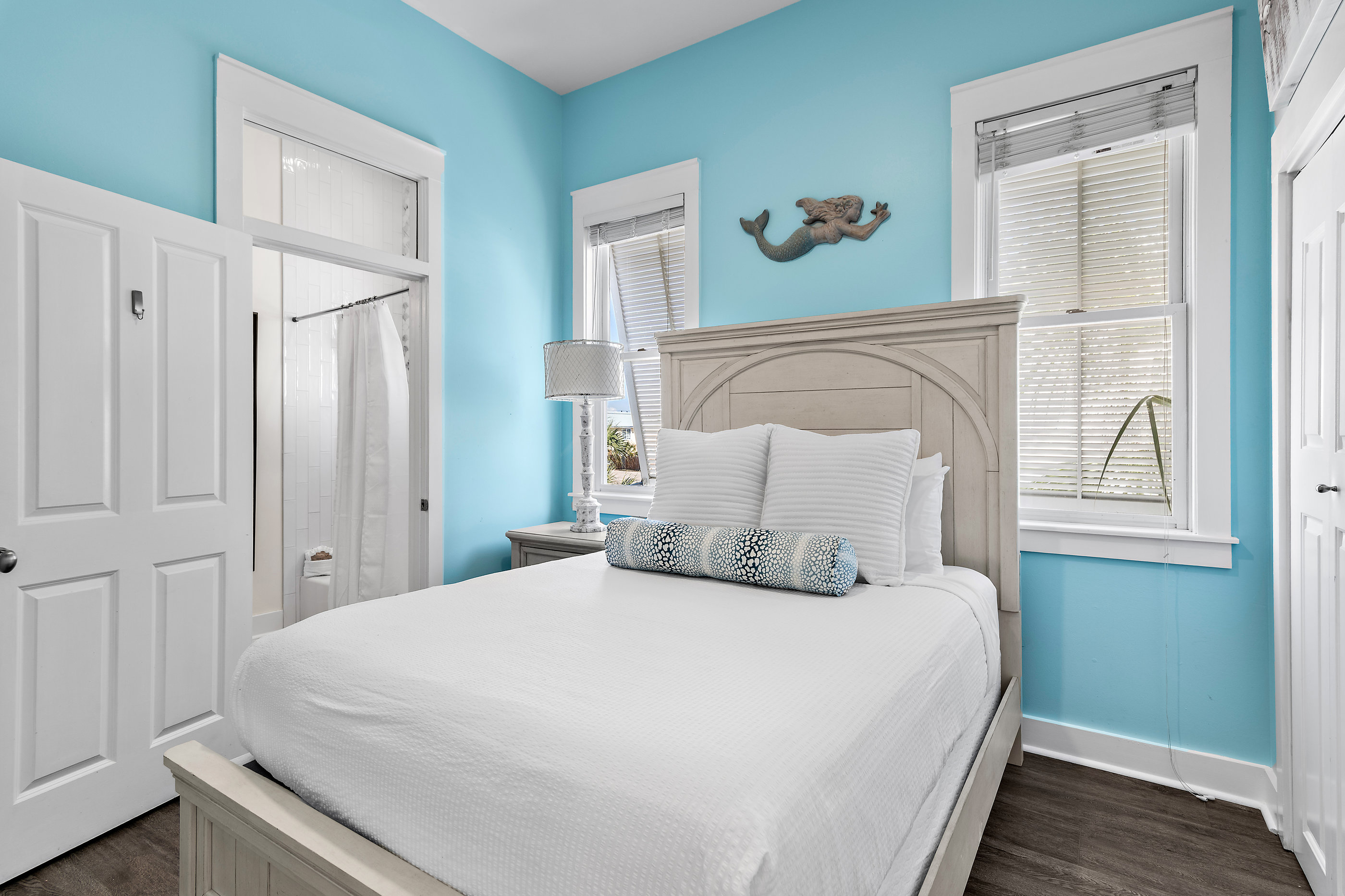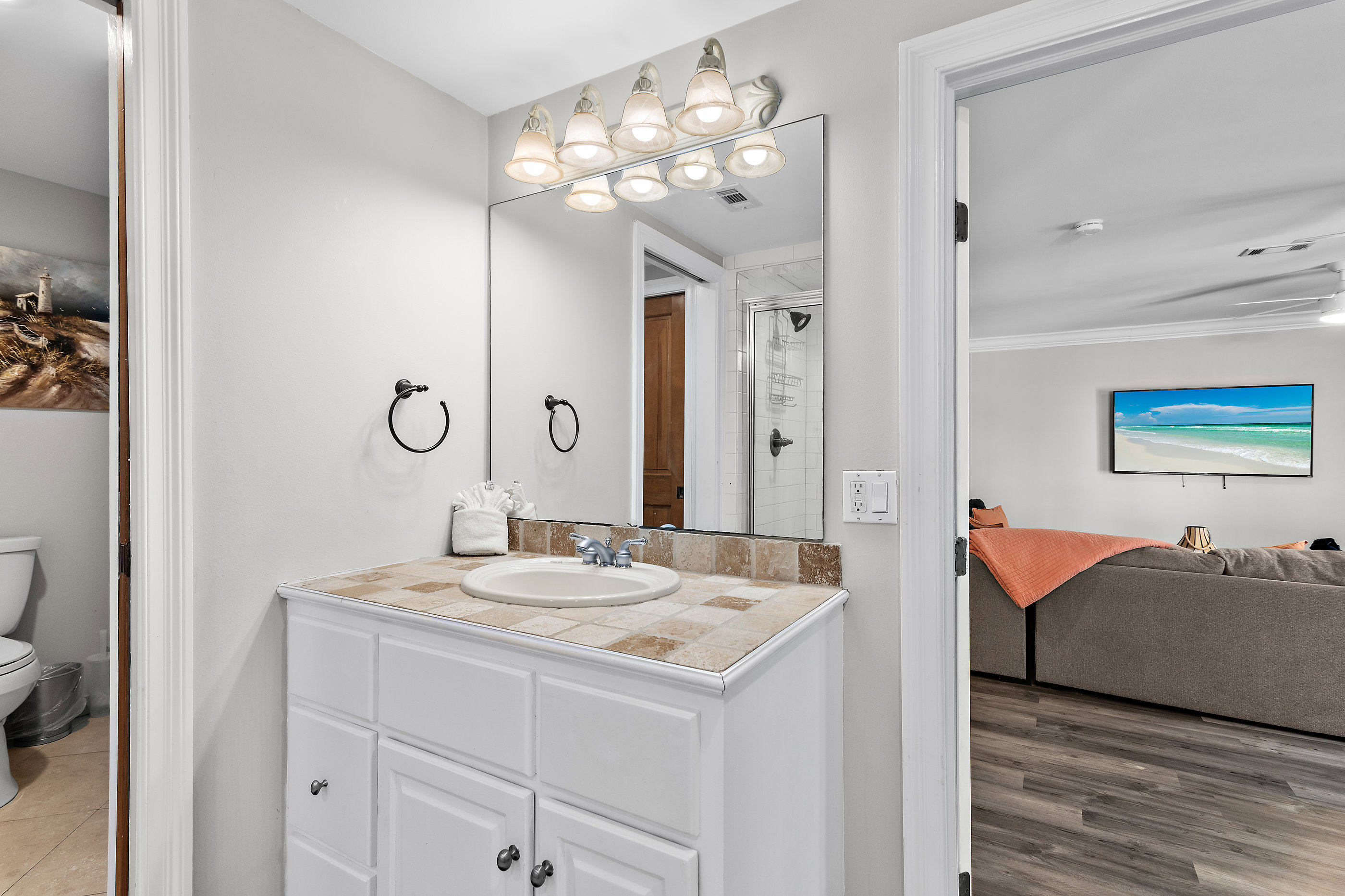 Sleeping accommodations on this level are designed for flexibility, with a queen-over-queen bunk in the living area and a twin-over-twin bunk room tucked away for extra privacy. A shared bathroom with a walk-in shower completes the space. Best of all, guests enjoy direct access to the private pool, making pool days seamless and stress-free.