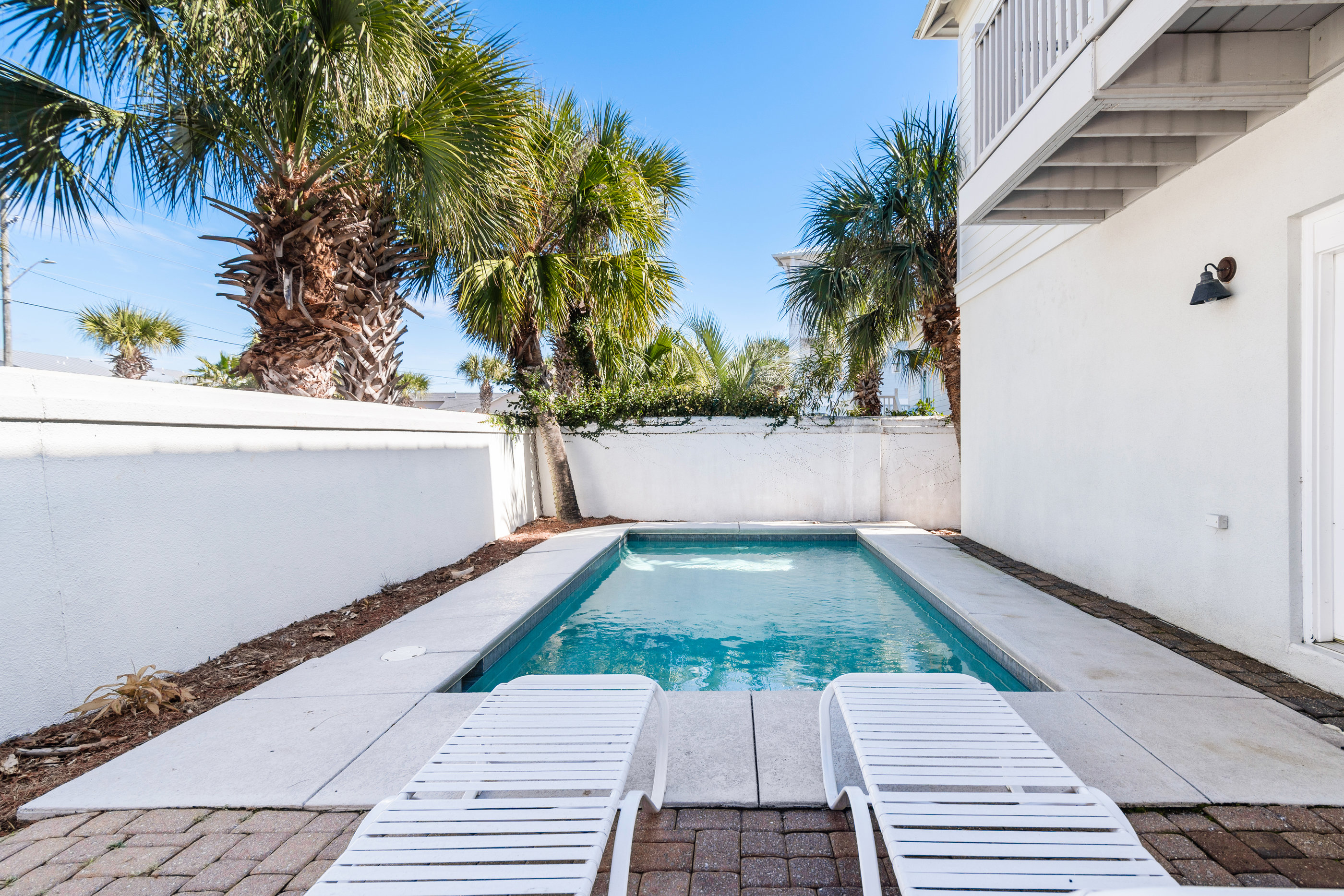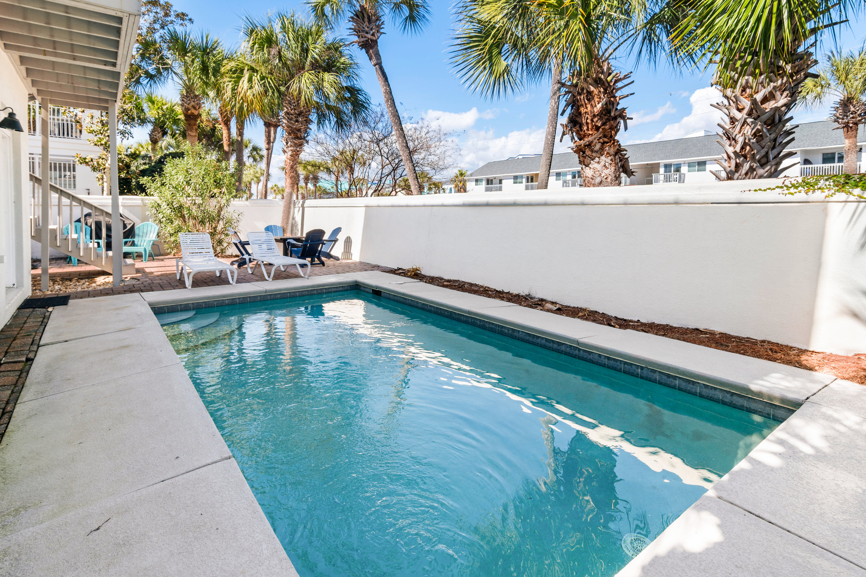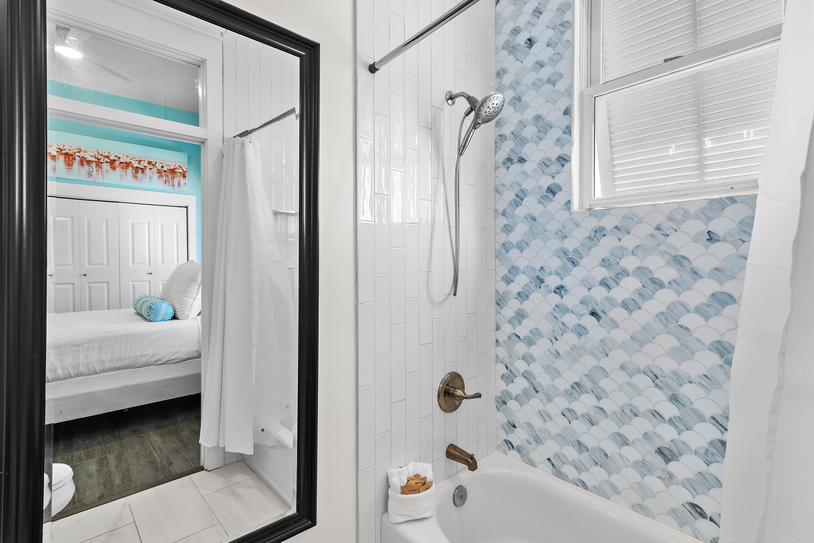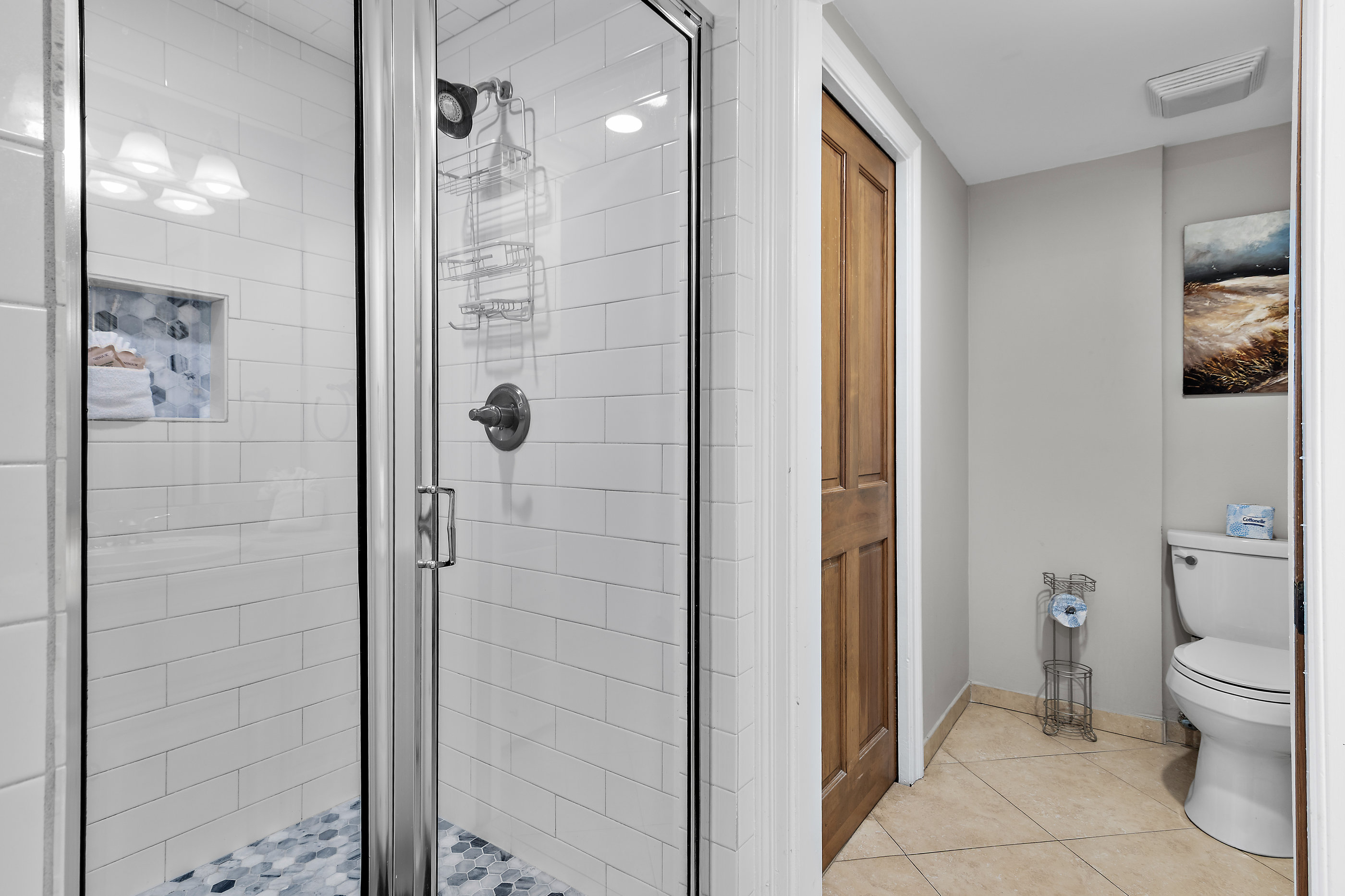 Sleeping accommodations on this level are designed for flexibility, with a queen-over-queen bunk in the living area and a twin-over-twin bunk room tucked away for extra privacy. A shared bathroom with a walk-in shower completes the space. Best of all, guests enjoy direct access to the private pool, making pool days seamless and stress-free.