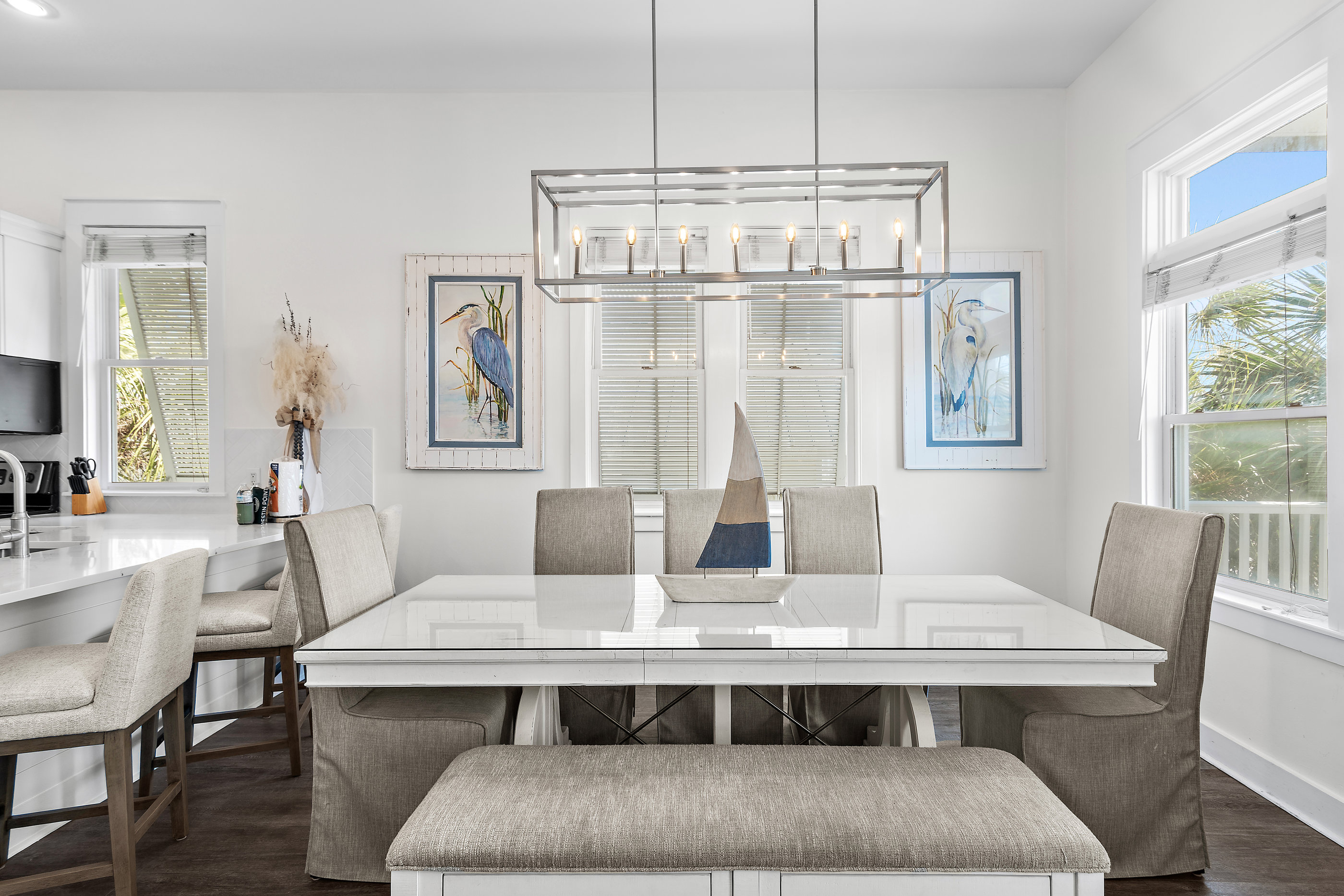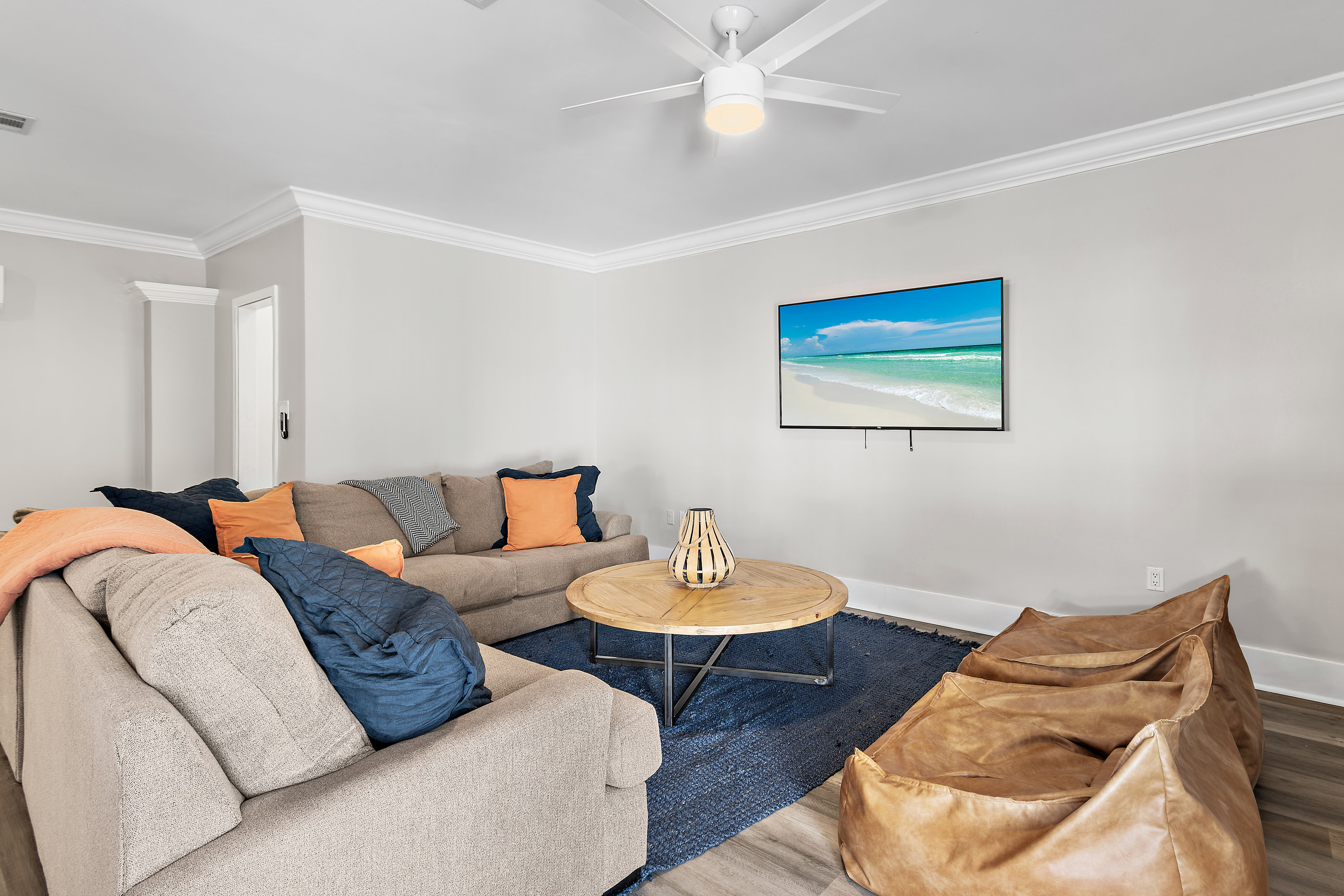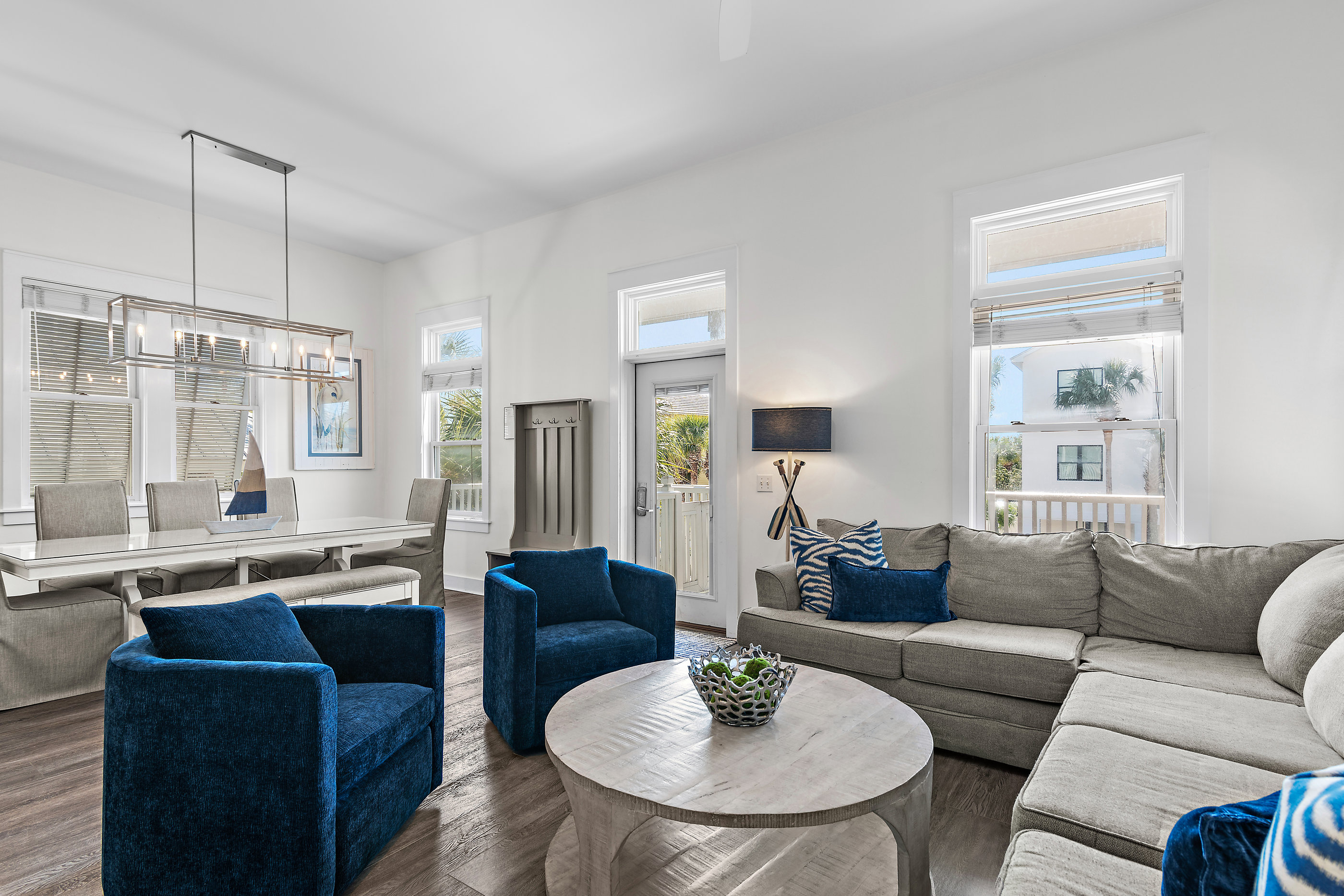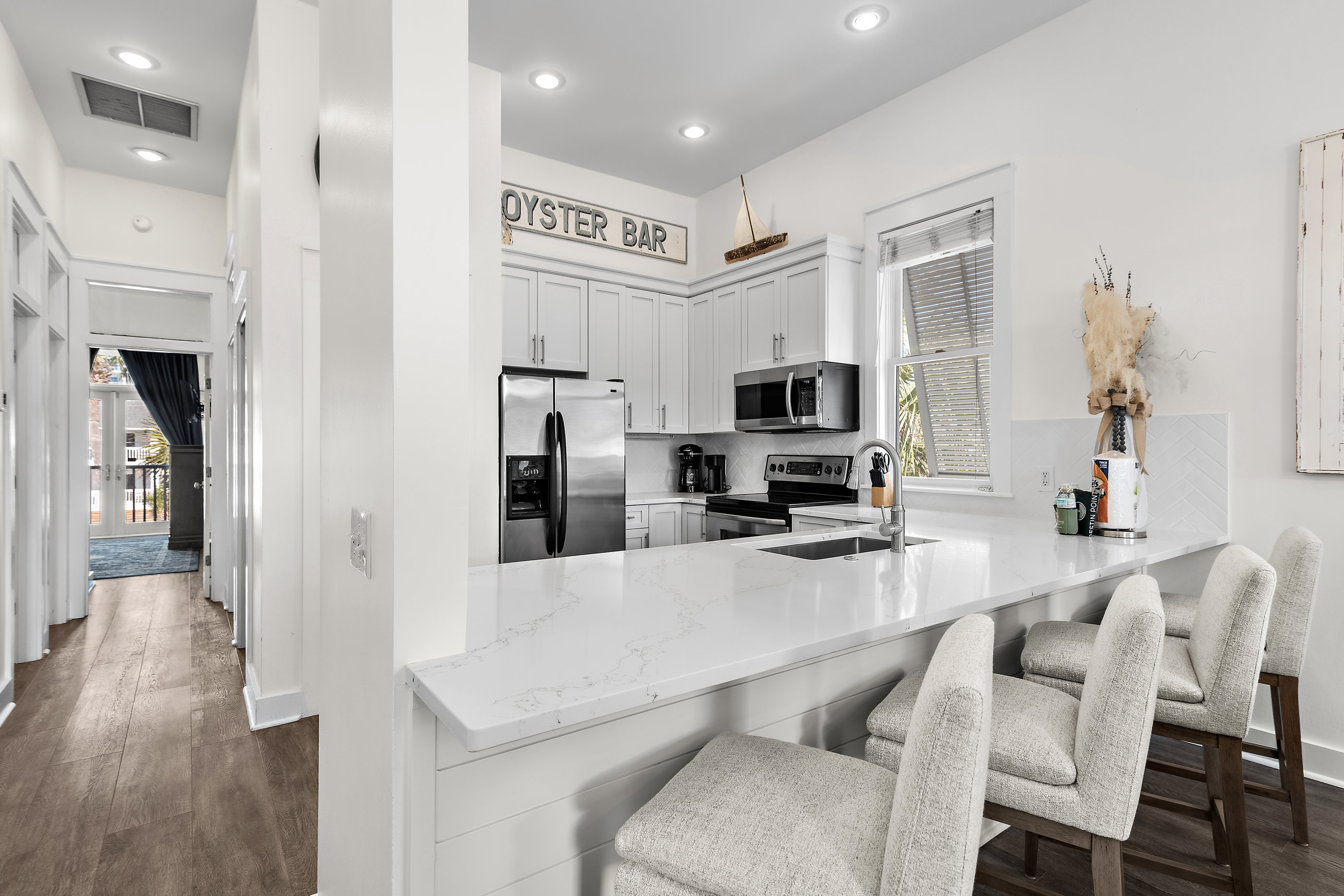 Upstairs, guests are welcomed into a bright and inviting coastal living space designed for entertaining and connection. The open-concept layout includes a fully equipped kitchen with high-end appliances, a breakfast bar with seating for five, a spacious dining area, and a comfortable living room with ample seating and a flat-screen TV—perfect for movie nights or relaxing evenings in.