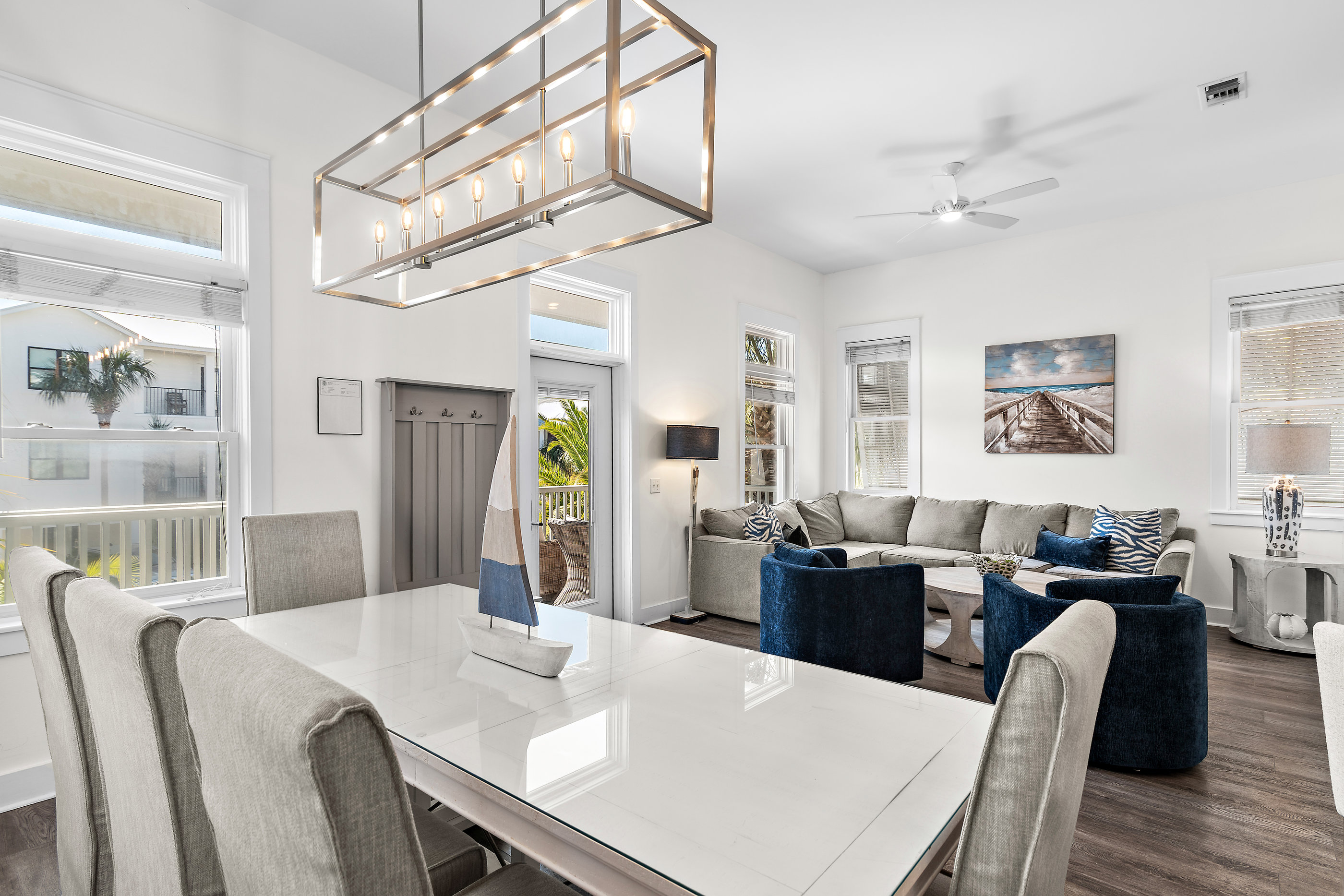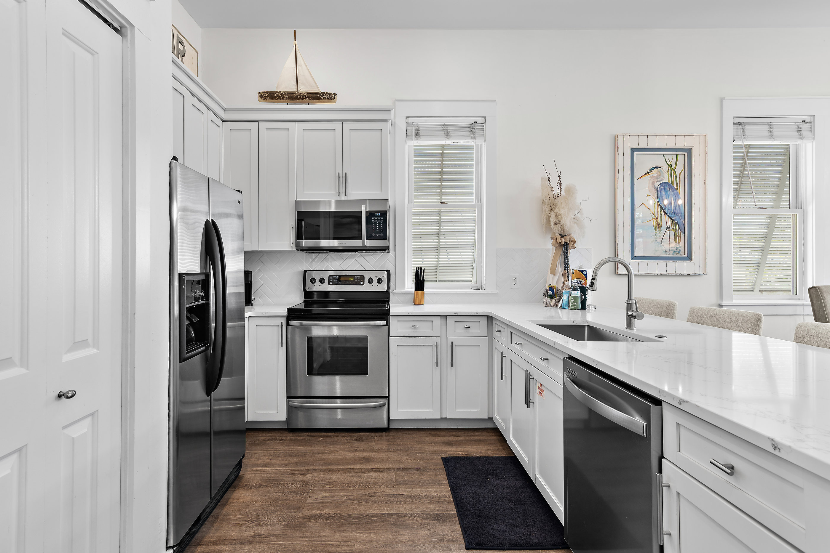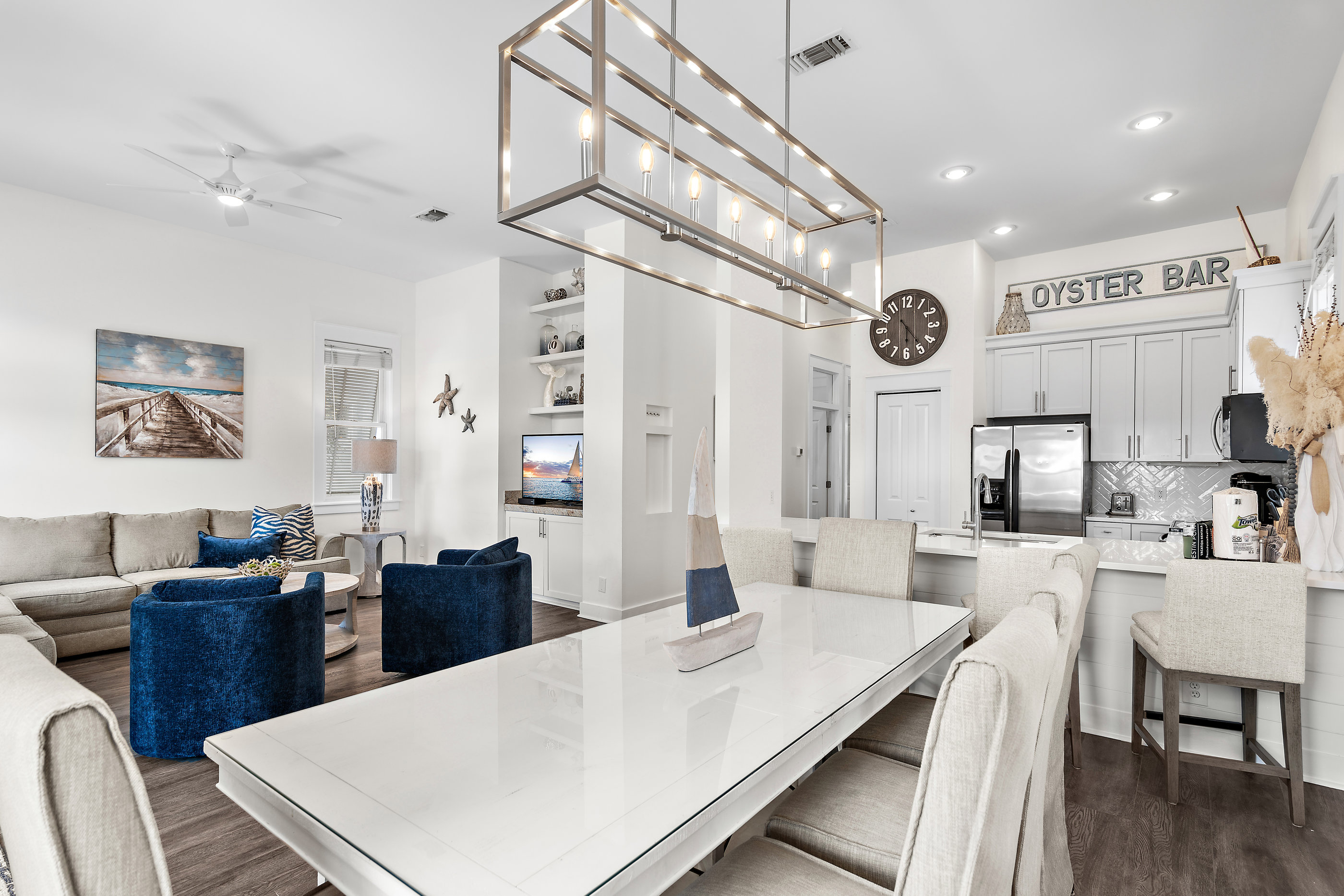 Upstairs, guests are welcomed into a bright and inviting coastal living space designed for entertaining and connection. The open-concept layout includes a fully equipped kitchen with high-end appliances, a breakfast bar with seating for five, a spacious dining area, and a comfortable living room with ample seating and a flat-screen TV—perfect for movie nights or relaxing evenings in.