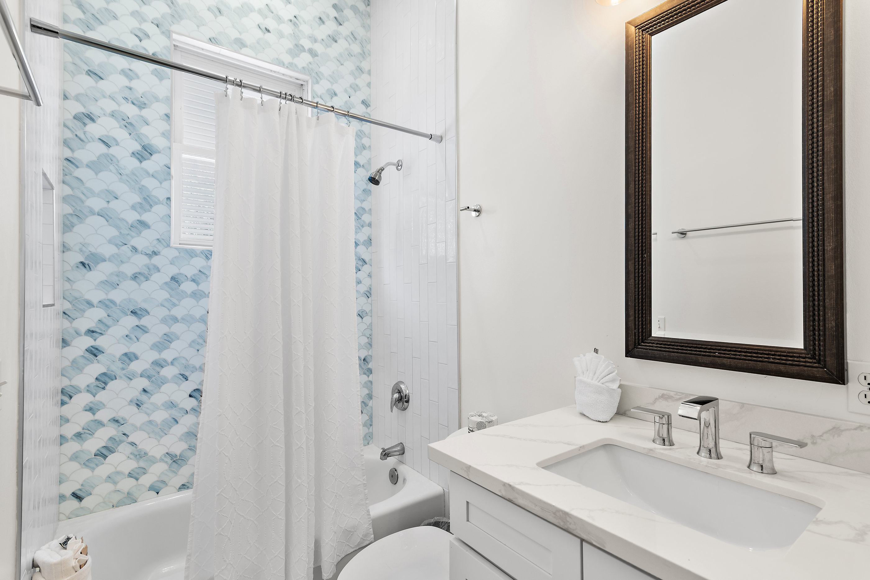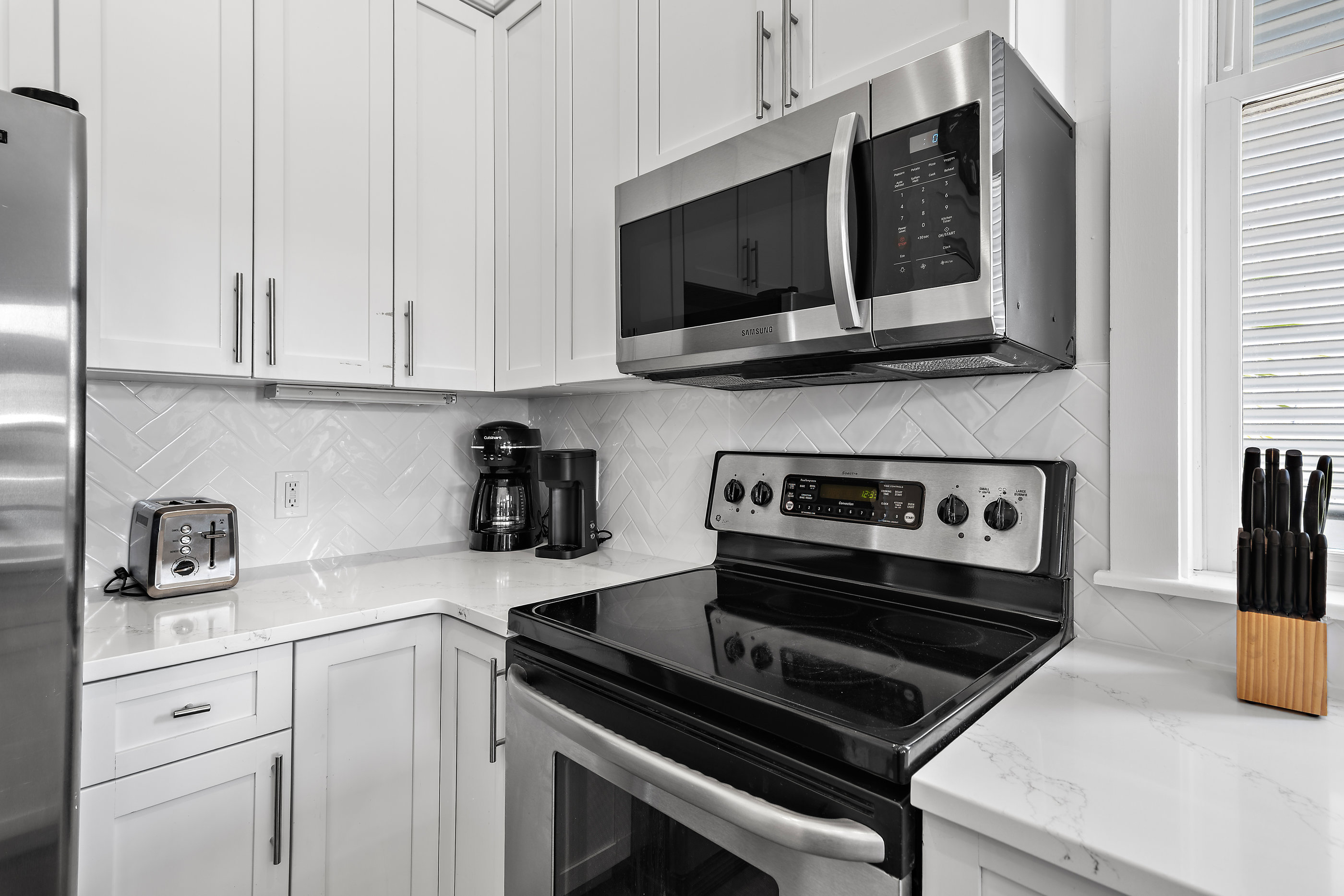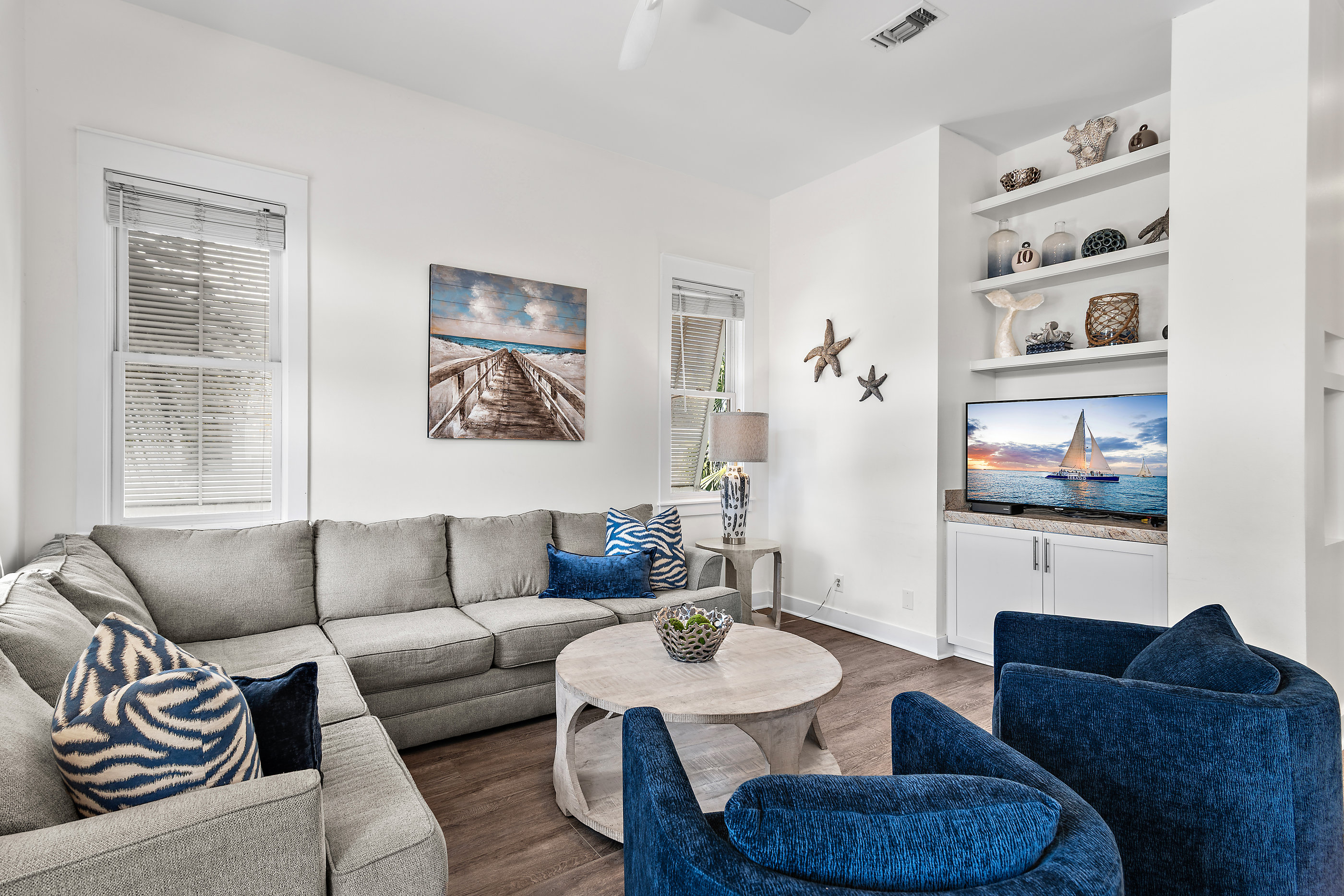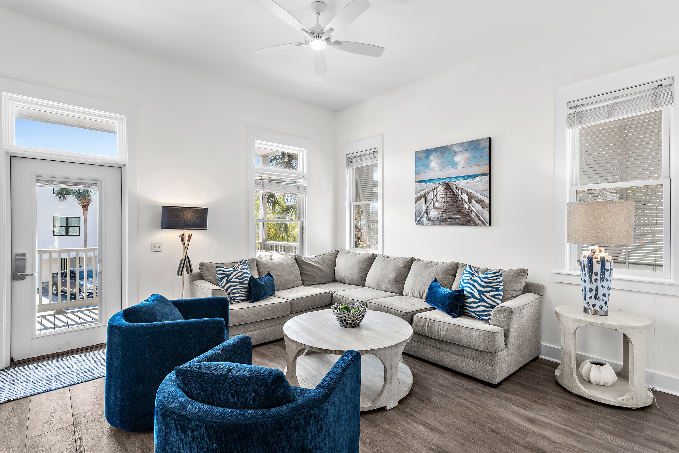 Upstairs, guests are welcomed into a bright and inviting coastal living space designed for entertaining and connection. The open-concept layout includes a fully equipped kitchen with high-end appliances, a breakfast bar with seating for five, a spacious dining area, and a comfortable living room with ample seating and a flat-screen TV—perfect for movie nights or relaxing evenings in.