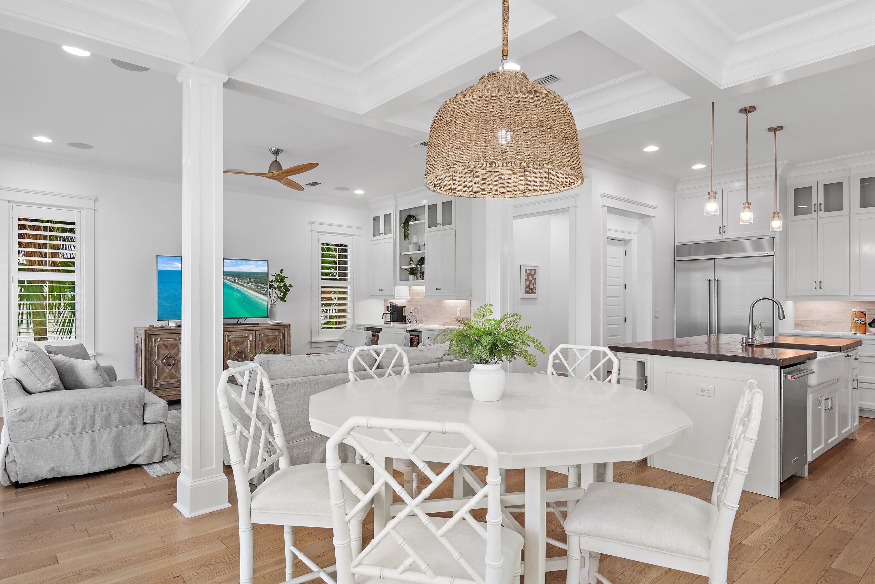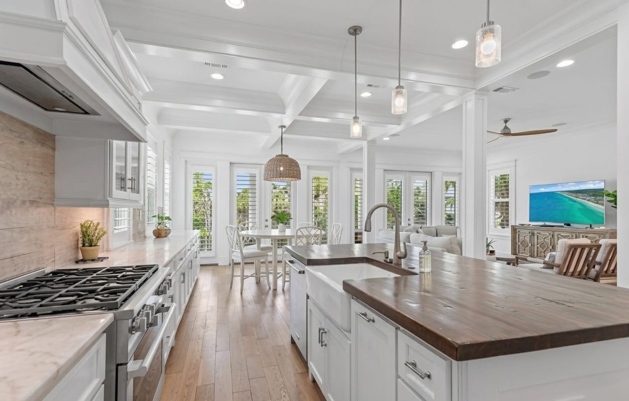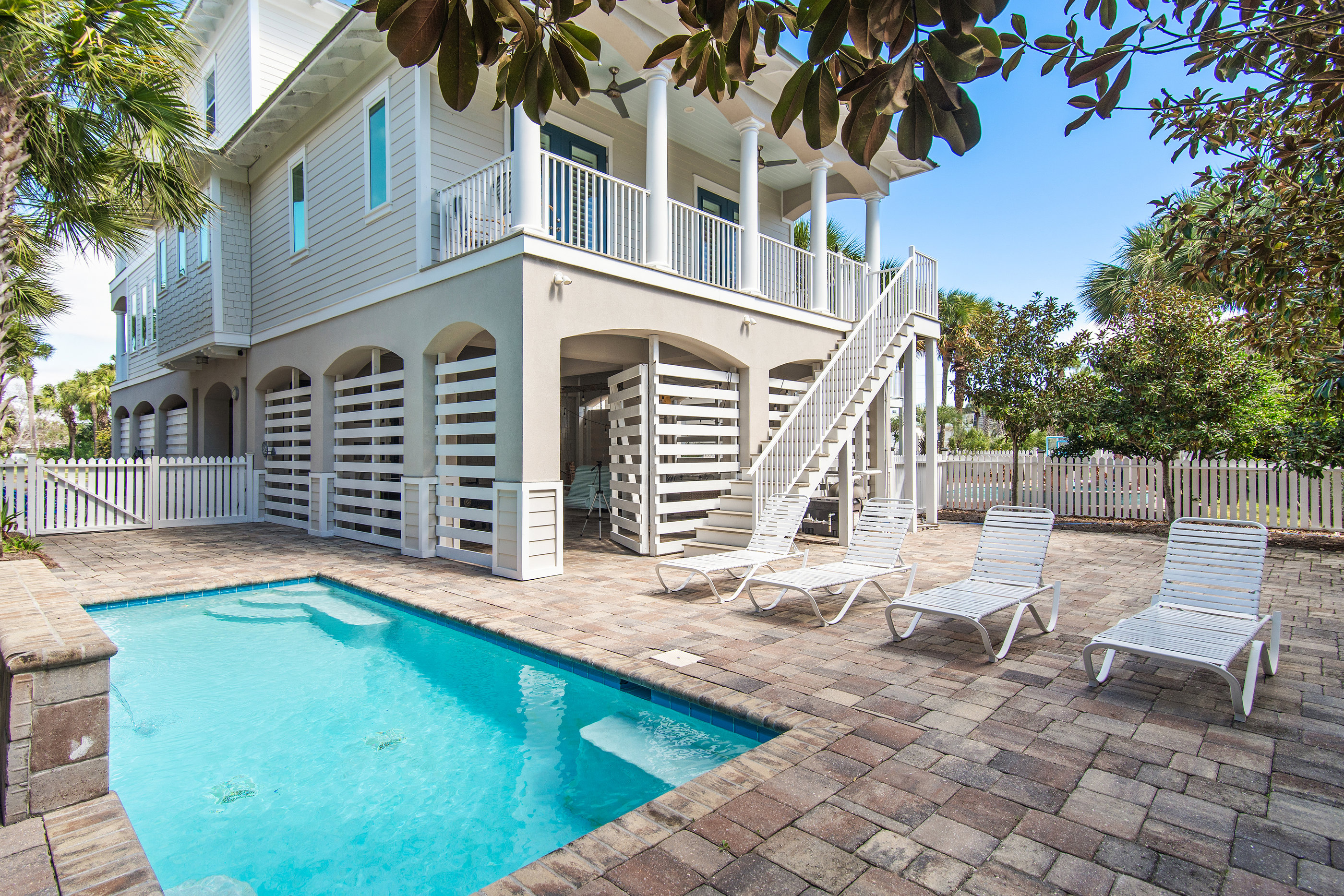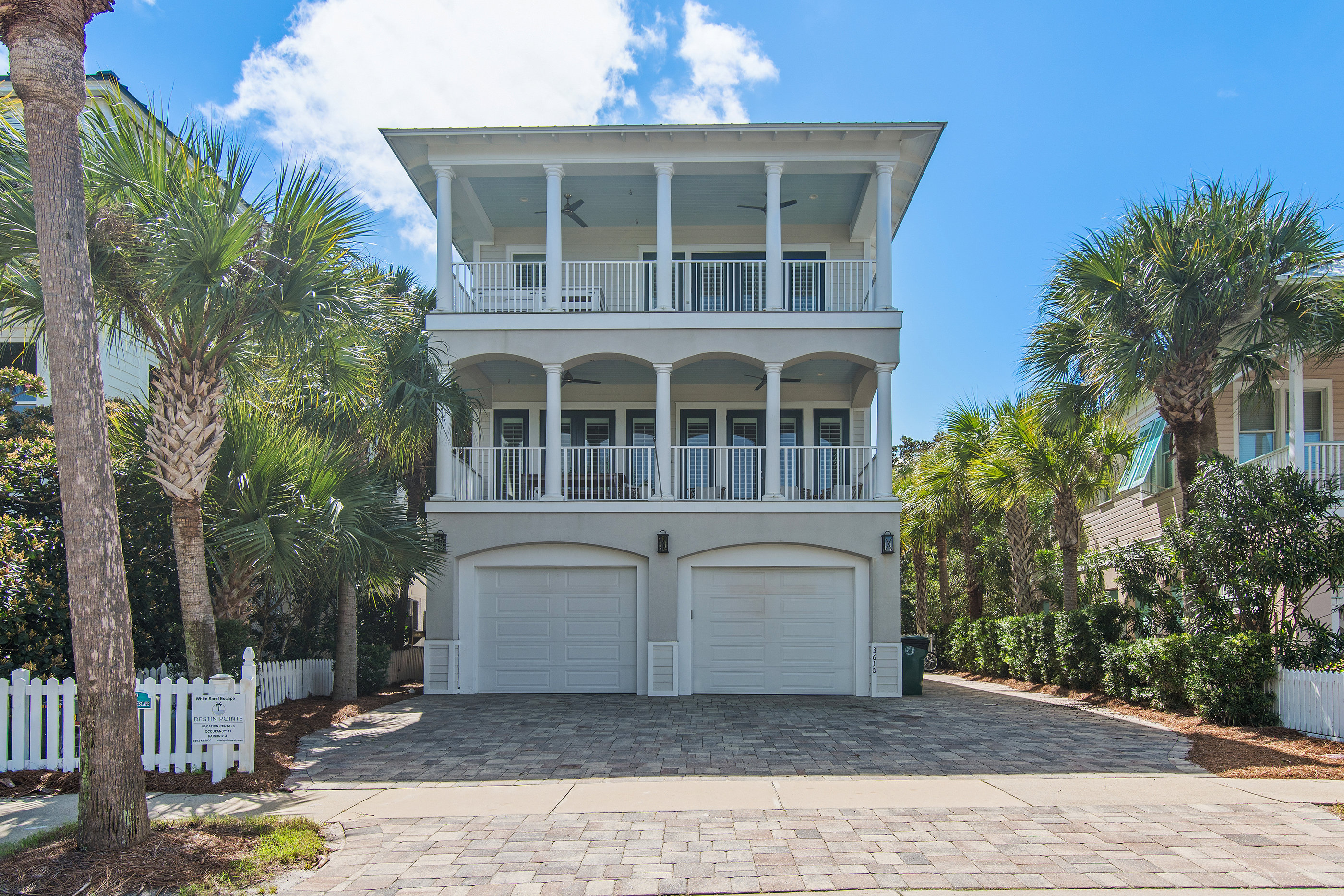 Welcome to White Sand Escape is a stunning 4-bedroom, 3.5 bathroom luxury home nestled within the private, gated community of Destin Pointe on Holiday Isle. This three-story residence combines elegance and comfort, featuring coffered ceilings, marble surfaces, a gourmet kitchen, high-end furnishings, and a private elevator providing easy access to every level.