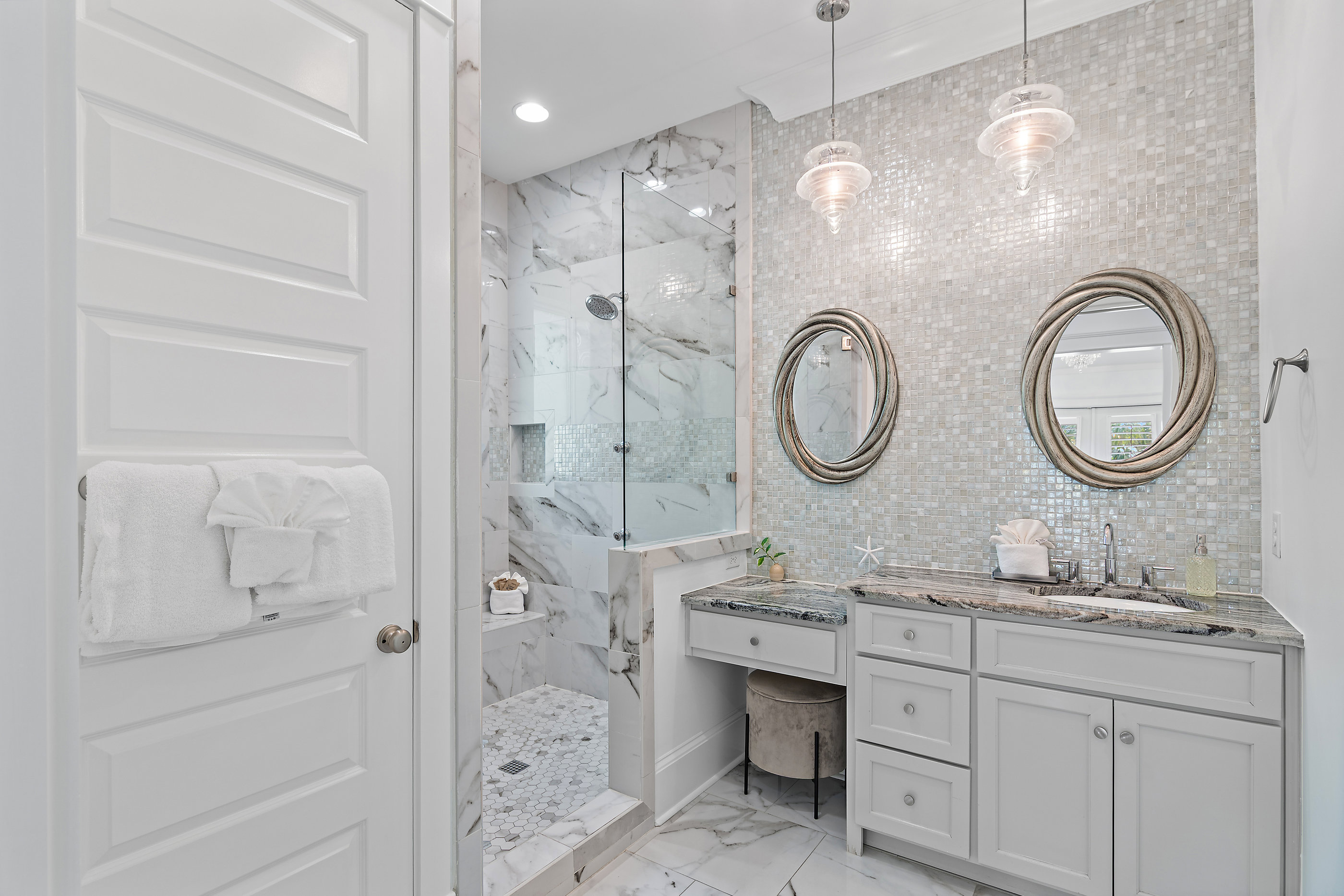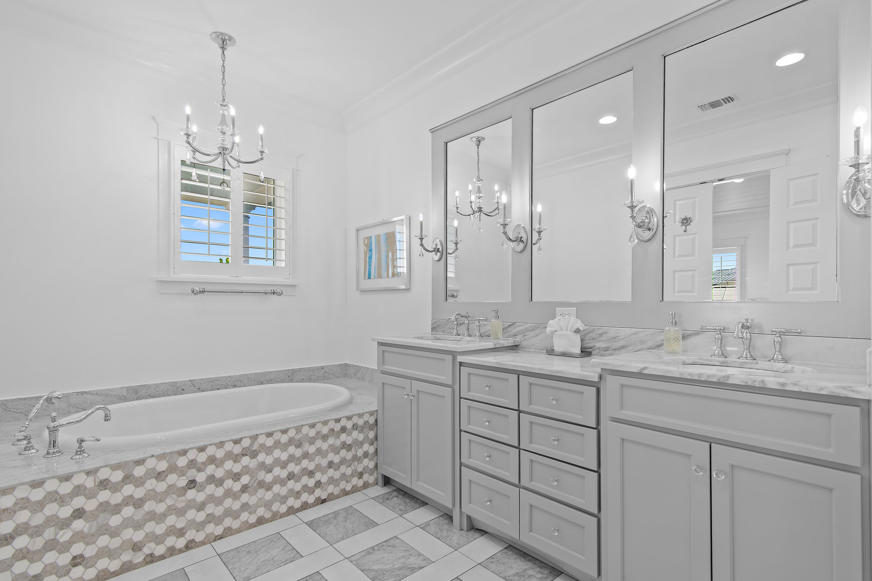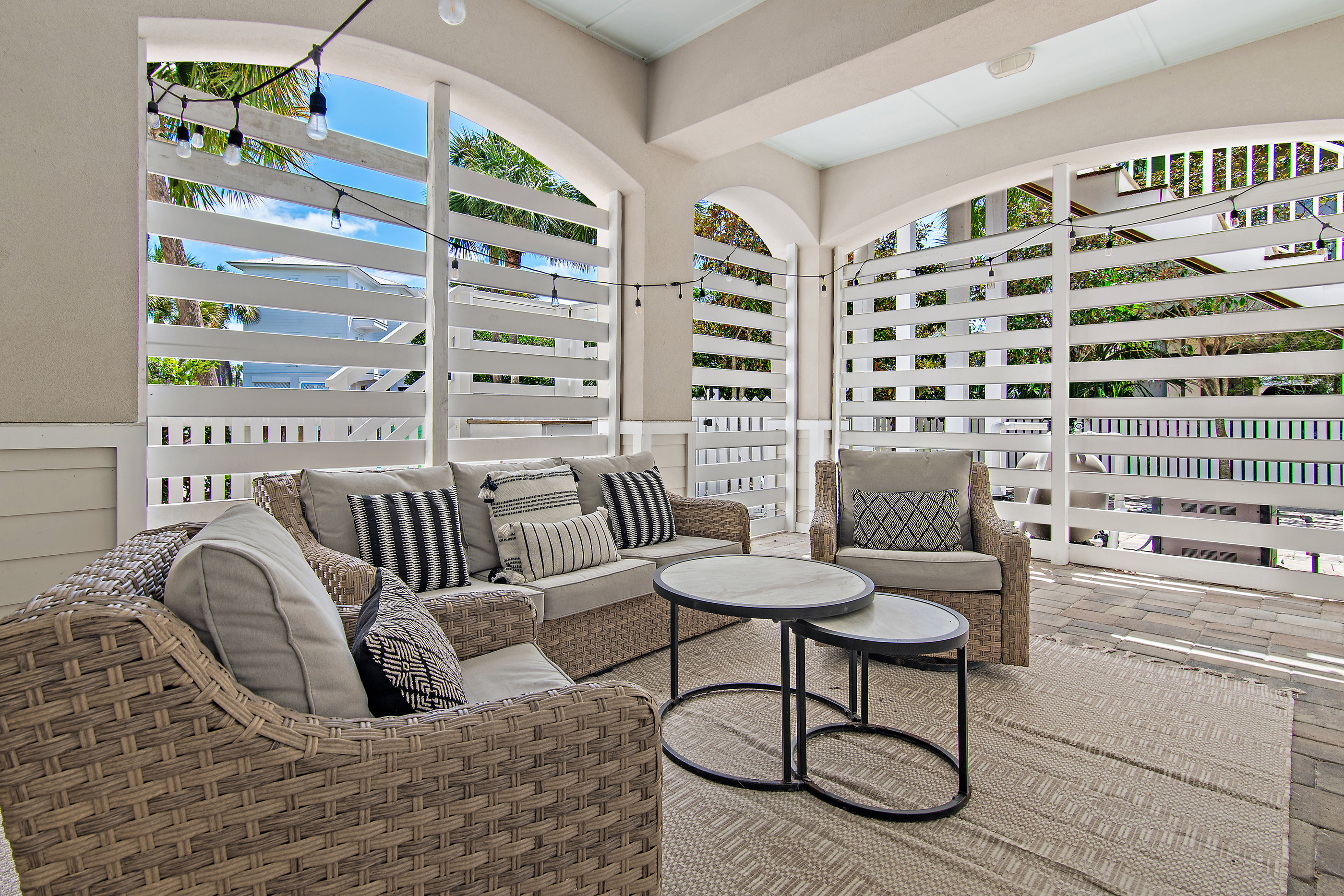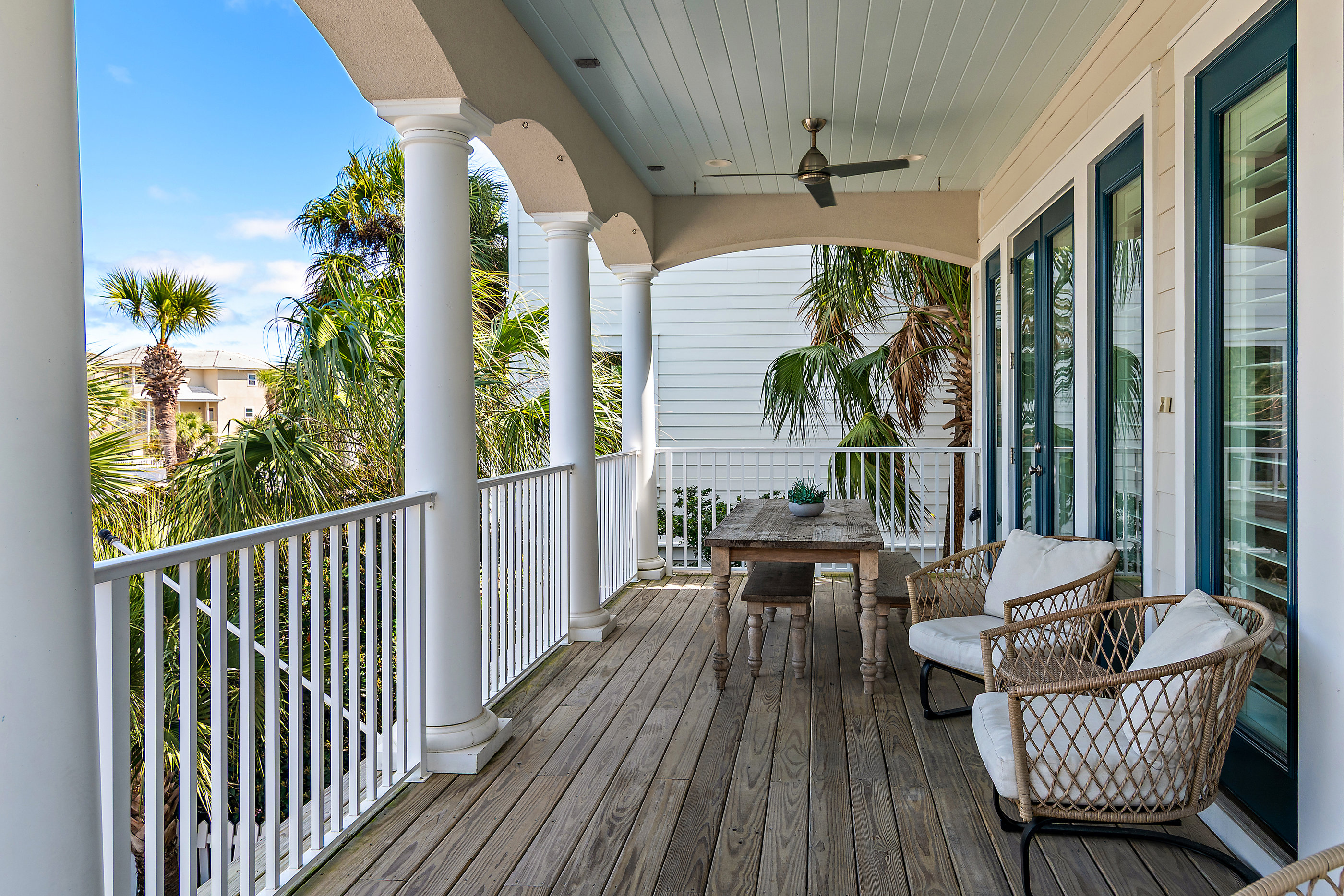 Welcome to White Sand Escape is a stunning 4-bedroom, 3.5 bathroom luxury home nestled within the private, gated community of Destin Pointe on Holiday Isle. This three-story residence combines elegance and comfort, featuring coffered ceilings, marble surfaces, a gourmet kitchen, high-end furnishings, and a private elevator providing easy access to every level.