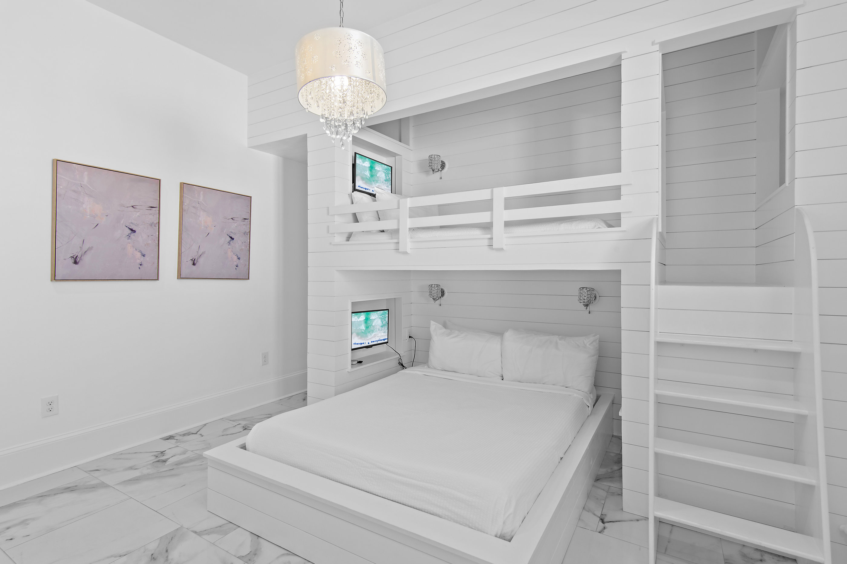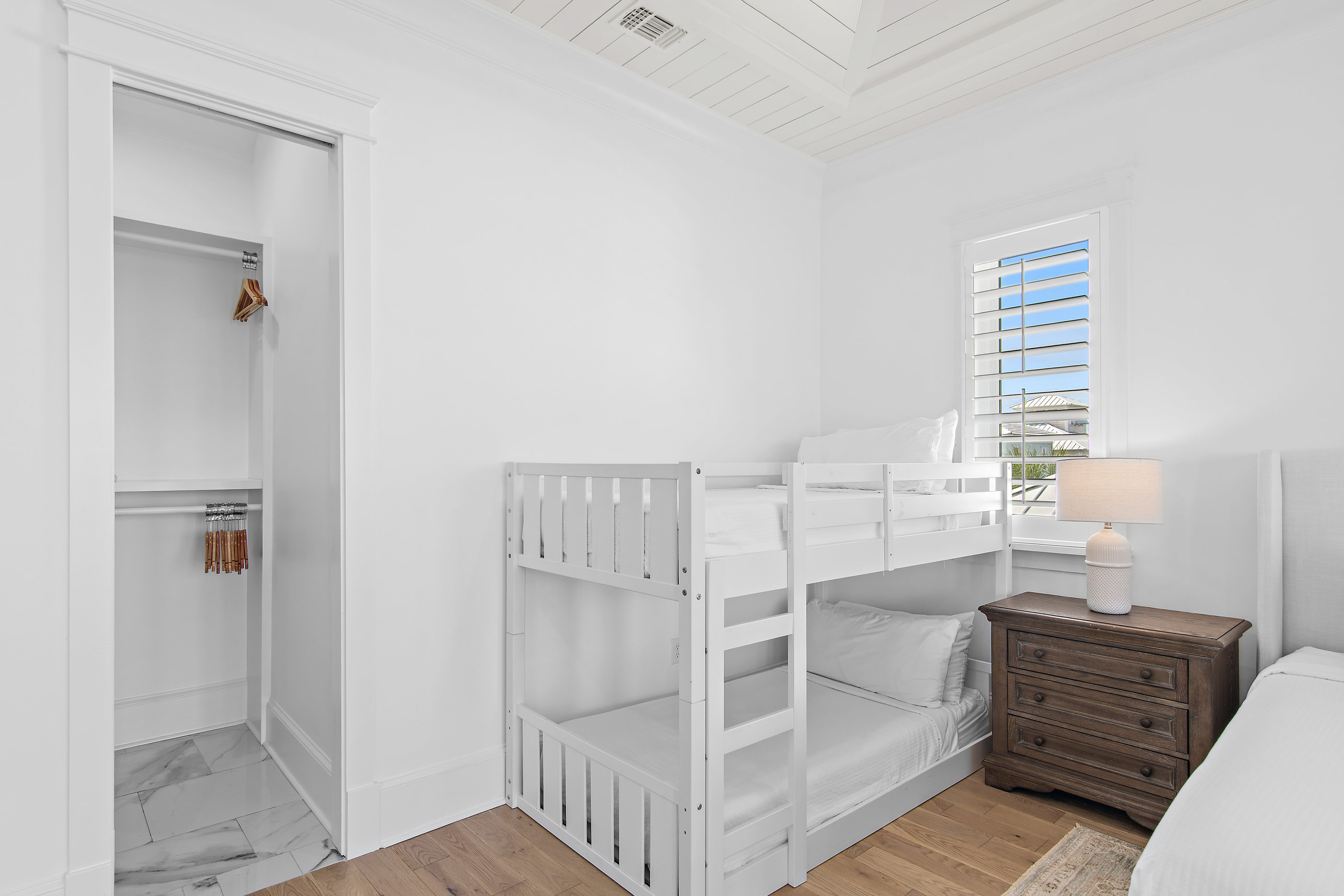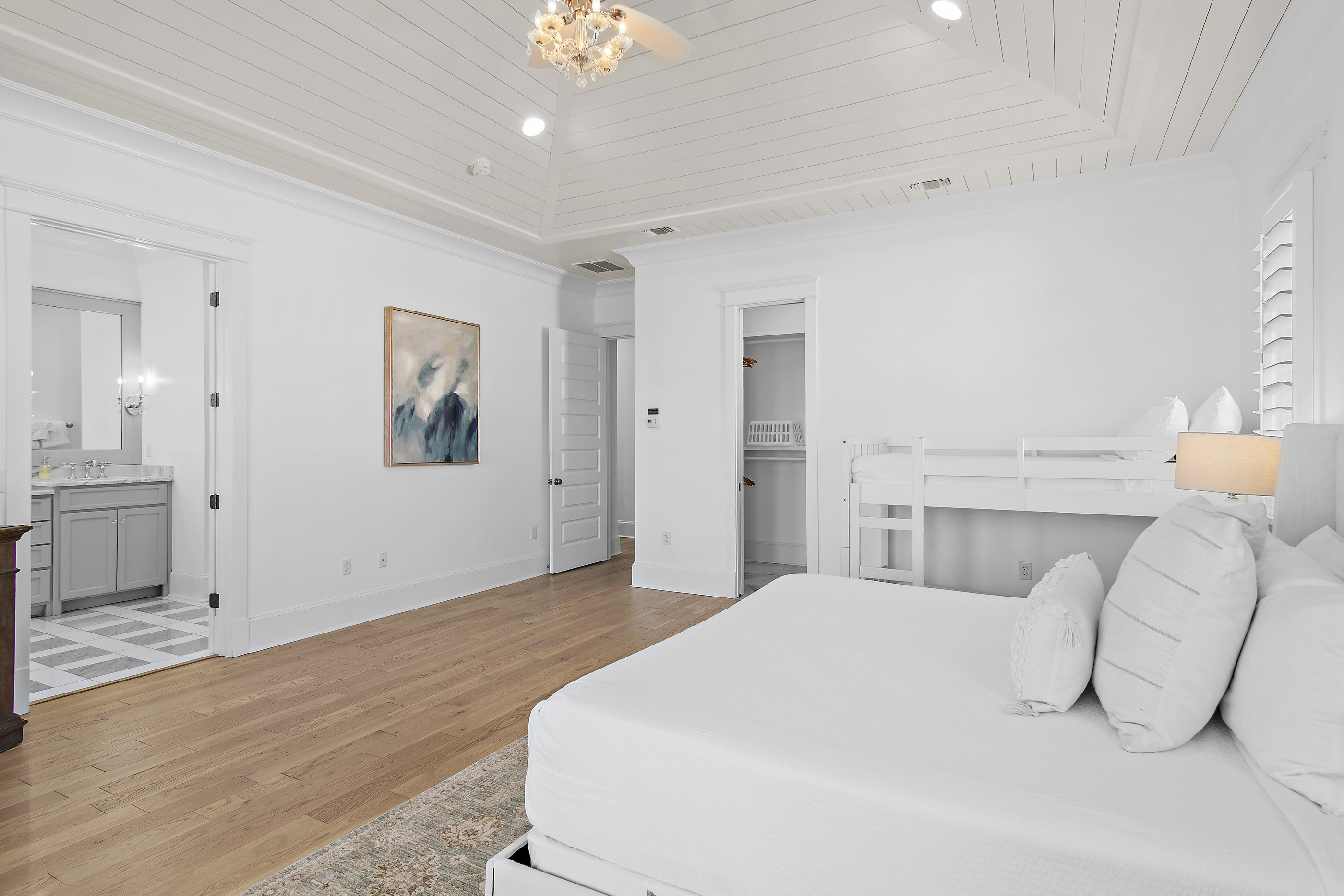 Inside, the first floor welcomes you with a spacious entryway and direct access to the outdoor area. The second floor features two beautifully appointed king bedrooms, each with its own private bathroom, one with a shower only and the other with a shower/tub combination. On the third floor, you'll find the luxurious primary suite with a king bed and a set of twin bunks, along with a spa-like ensuite bathroom featuring a separate shower and tub. Also on this level is a cozy bunk room with a twin-over-full bunk and a convenient kitchenette.